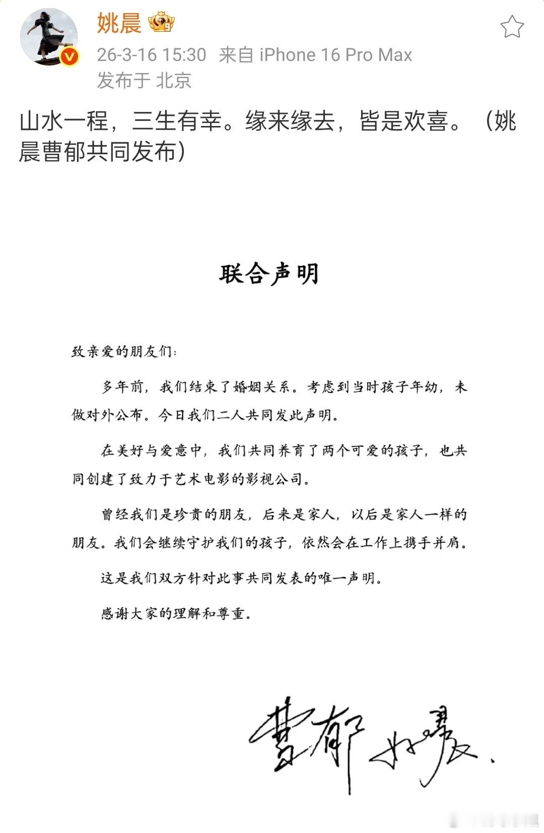 姚晨曹郁婚后育有一儿一女姚晨曹郁官宣离婚,说多年前就结束了婚姻,当时考虑到孩子年幼没公开。两人在2012年结婚,婚后育有一子(小土豆)一女(小茉莉),还一起开了影视公司,以后要当家人一样的朋友,继续守护孩子和合作工作…很体面的告别,祝福二人各自安好!