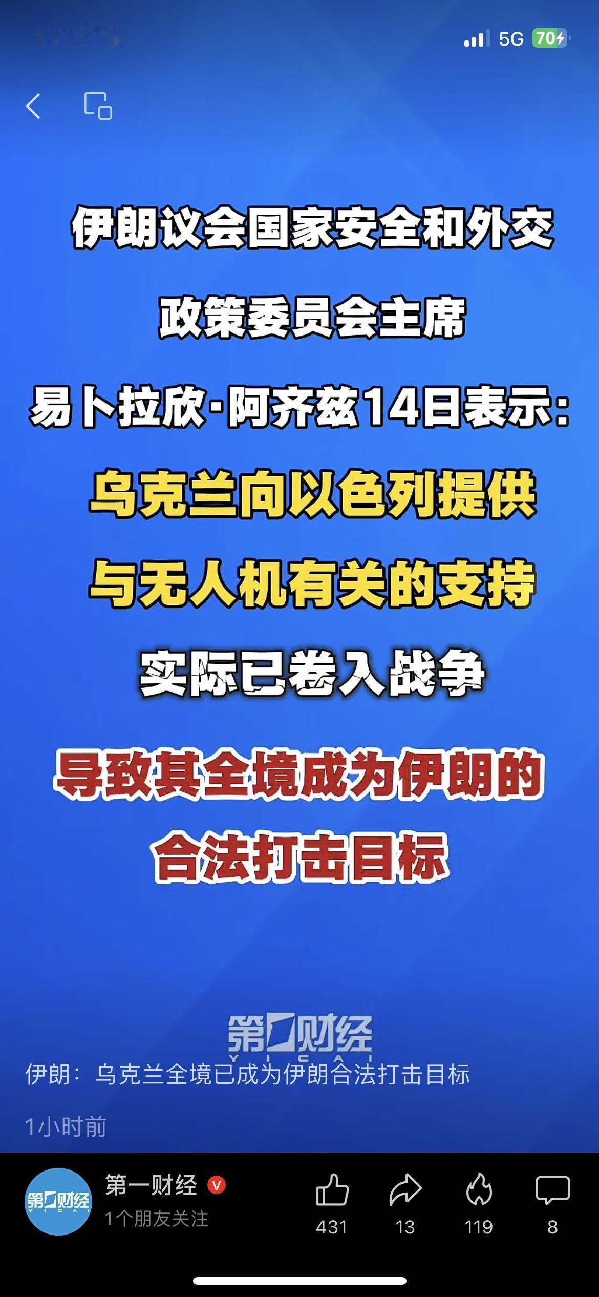 伊朗方面最新表态:乌克兰向以色列提供无人机相关支持,实际上已卷入冲突,因此乌克兰全境成为合法打击目标。 这一表态一出,地区局势明显更紧张。之前伊朗袭击已经导致石油港口暂停作业,油价跟着上涨,现在范围再扩大,变数更多。 国际局势瞬息万变,每一步都会影响能源、物价和全球市场。大家多看正规消息,理性看待,别被小道消息带偏。 伊朗局势 地缘政治 国际热点