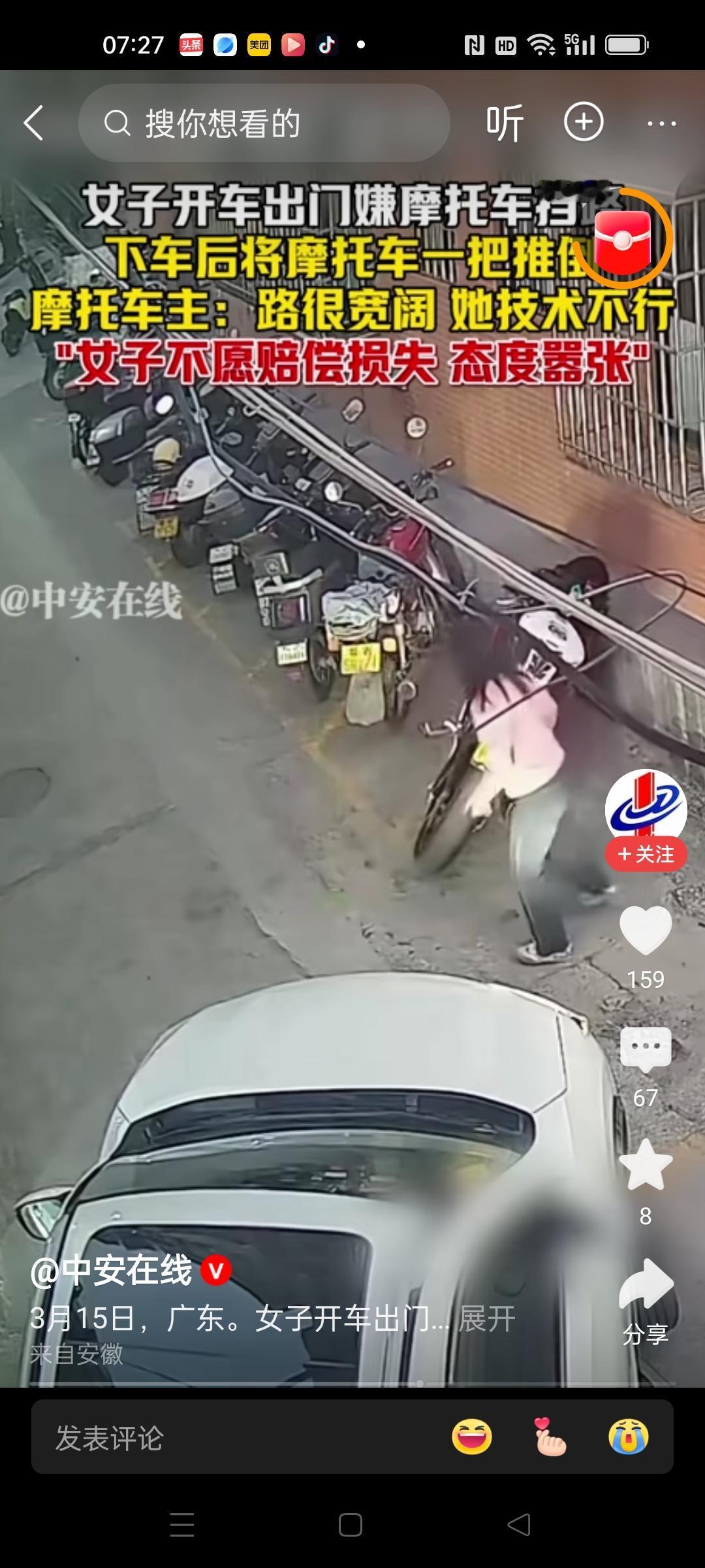 是技术不行还是人本来就太坏? 女子觉得摩托车挡路,就下车把车推倒,然后开车走了。问题是推倒后,并没有让路变得更宽啊,本来就可以通过啊! 难道单纯是看摩托车不顺眼?有些人开上车,就觉得自己是人上人了,所有东西都要为自己让道。 别人停车并没有挡路,你损坏别人的车,还不赔偿,还态度嚣张。 是不是损失不大,报警也不会立案,这情况就没法惩治了吗?