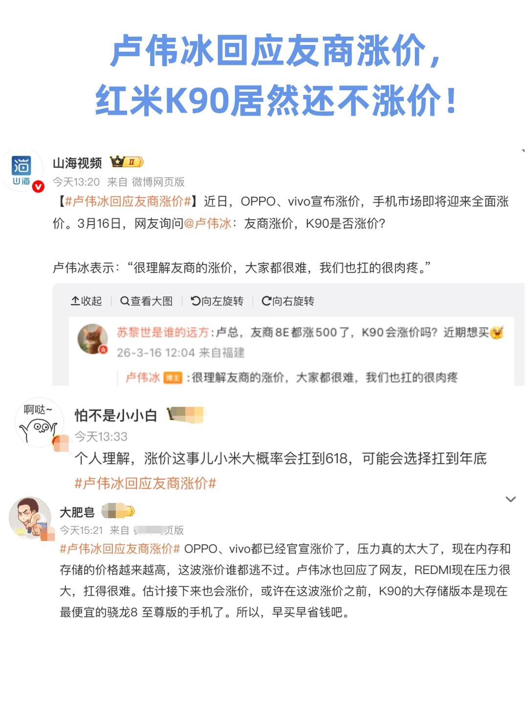 友商接连涨价,小米居然还没涨价 没想到小米还在扛着啊,卢伟冰说扛着很肉疼,但估计涨价是早晚的事,只是还没来。 有人说会扛到618,我觉得不可能吧,像是红米K90现在的性价比很高,两千多就行,但友商同价位的已经涨价到3000多了... 所以,想买手机的抓紧了,后面真的不便宜 手机涨价 小米 红米K90