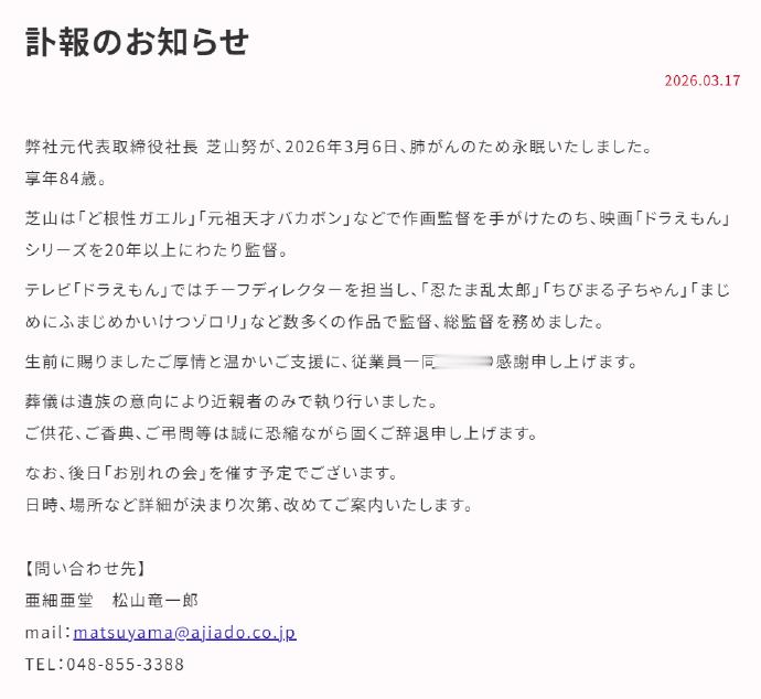 哆啦A梦导演芝山努去世动画导演芝山努去世 据日媒,《哆啦A梦》《樱桃小丸子》《忍者乱太郎》导演芝山努因病去世,享年84岁。