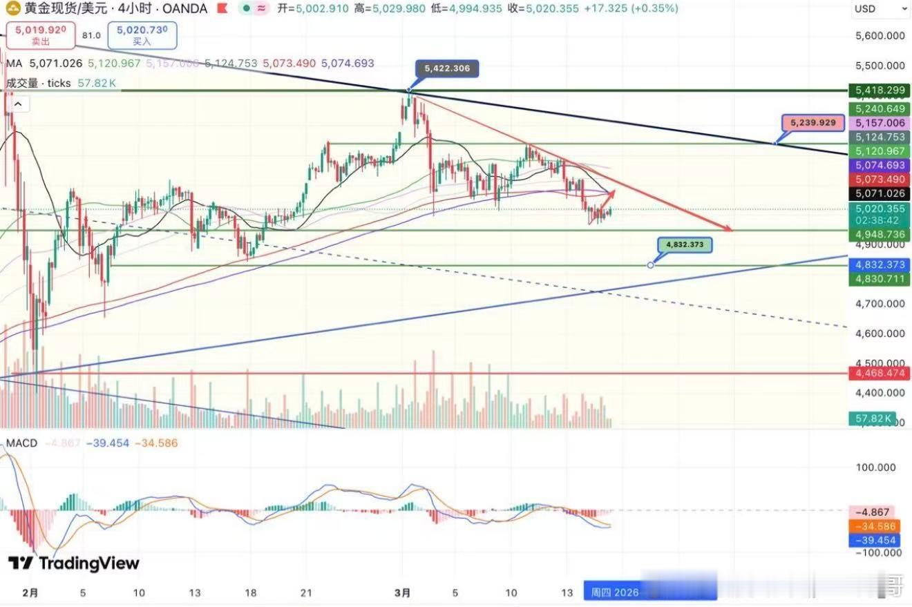 黄金在隔夜美盘的反弹未能延续,早盘继续表现为冲高受阻。短周期来看,30分钟图MA89在5033一线形成压制。不过在回落过程中成交量并未明显放大,说明抛压有限,短线仍存在一定反弹空间,5005 - 5000附近或有一次短多机会。从4小时结构 来看,均线系统在 5070上方形成空头排列,整体趋势依然偏弱。但成交量以及 MACD空头动能柱逐渐缩窄,表明下跌动能正在减缓,市场可能进入反弹修复阶段。日内思路:先多后空,以逢高做空为主。短线可关注回调后的反弹机会,但上方关键压力附近仍是更值得关注的做空位置。