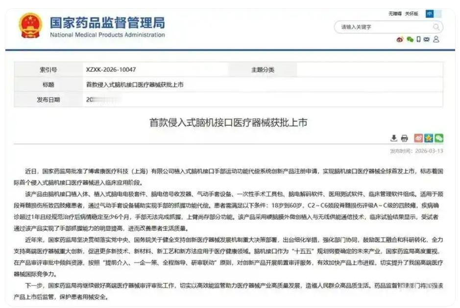 重磅!全球首张“意念控手”证落地中国,瘫痪患者有救了! 🔥大新闻!就在今天,国家药监局正式给一家叫“博睿康”的中国公司发了张“王牌”——全球首张侵入式脑机接口三类医疗器械注册证!这意味着,以前只在科幻电影里出现的“用脑子控制手”,现在在中国正式合法上市了! 🤖这玩意儿到底咋用? 简单说,就是给那些因为颈椎受伤导致四肢瘫痪、手完全动不了的患者,在大脑表面微创植入一个小芯片。这个芯片能读懂你脑子里“想抓手”的信号,然后无线传输给手上的气动手套。你想抓杯子,手就自动抓;想拿筷子,手就配合动。真正实现了“心想事成”,让瘫痪的手重新听大脑指挥! 🌟为啥这事这么牛? 全球第一:以前这技术都被国外巨头(像马斯克的Neuralink)垄断,而且大多还在做实验。咱们中国这次直接抢跑,成了全世界第一个获批上市的,彻底打破了国外垄断! 真能治病:这不是概念品,是实打实的救命神器。专门针对颈脊髓损伤患者,临床测试里,好多多年没动过手的病友,终于能自己吃饭、喝水了,生活质量直接起飞。 国家给力:能这么快上市,多亏了国家把脑机接口列为未来产业,药监局更是开绿灯,“一对一”帮着企业攻关,这才让高科技这么快变成老百姓能用上的产品。 💡小编点评: 这不仅是技术的突破,更是无数瘫痪家庭的希望之光!从实验室到病床,中国脑机接口迈出了最关键的一步。以后,“奇迹”不再是传说,而是触手可及的现实。为中国智造点赞,为生命科技喝彩!🇨🇳🧠💪 脑机接口 中国科技 医疗突破 意念控手 博睿康