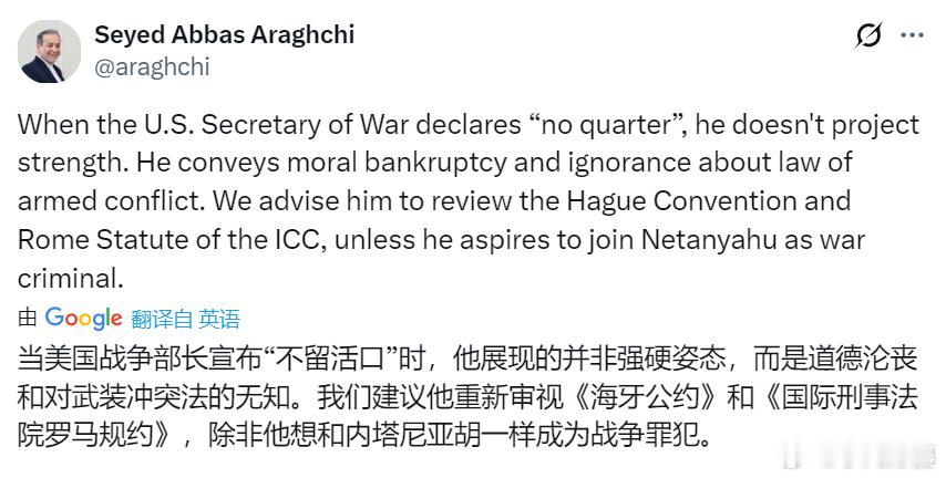 伊朗外长阿拉格奇:当美国战争部长宣布“不留活口”时,他展现的并非强硬姿态,而是道德沦丧和对武装冲突法的无知。我们建议他重新审视《海牙公约》和《国际刑事法院罗马规约》,除非他想和内塔尼亚胡一样成为战争罪犯。美伊以冲突美国陷入孤立美军被曝对伊朗退出选项黄媒不会说的真相