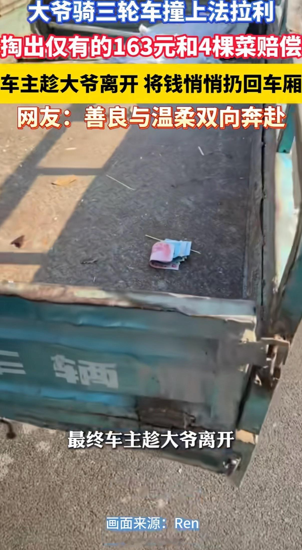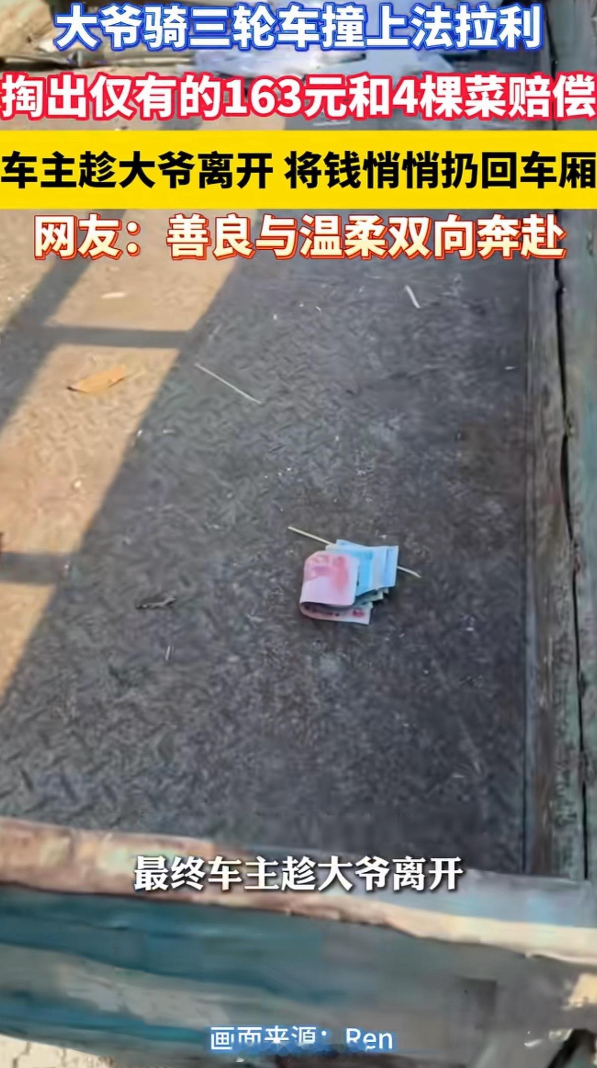 大爷撞法拉利掏163元和4棵菜赔偿这最后车里的钱就这么放着吗会不会被风吹走,幸运路人是最后赢家👍