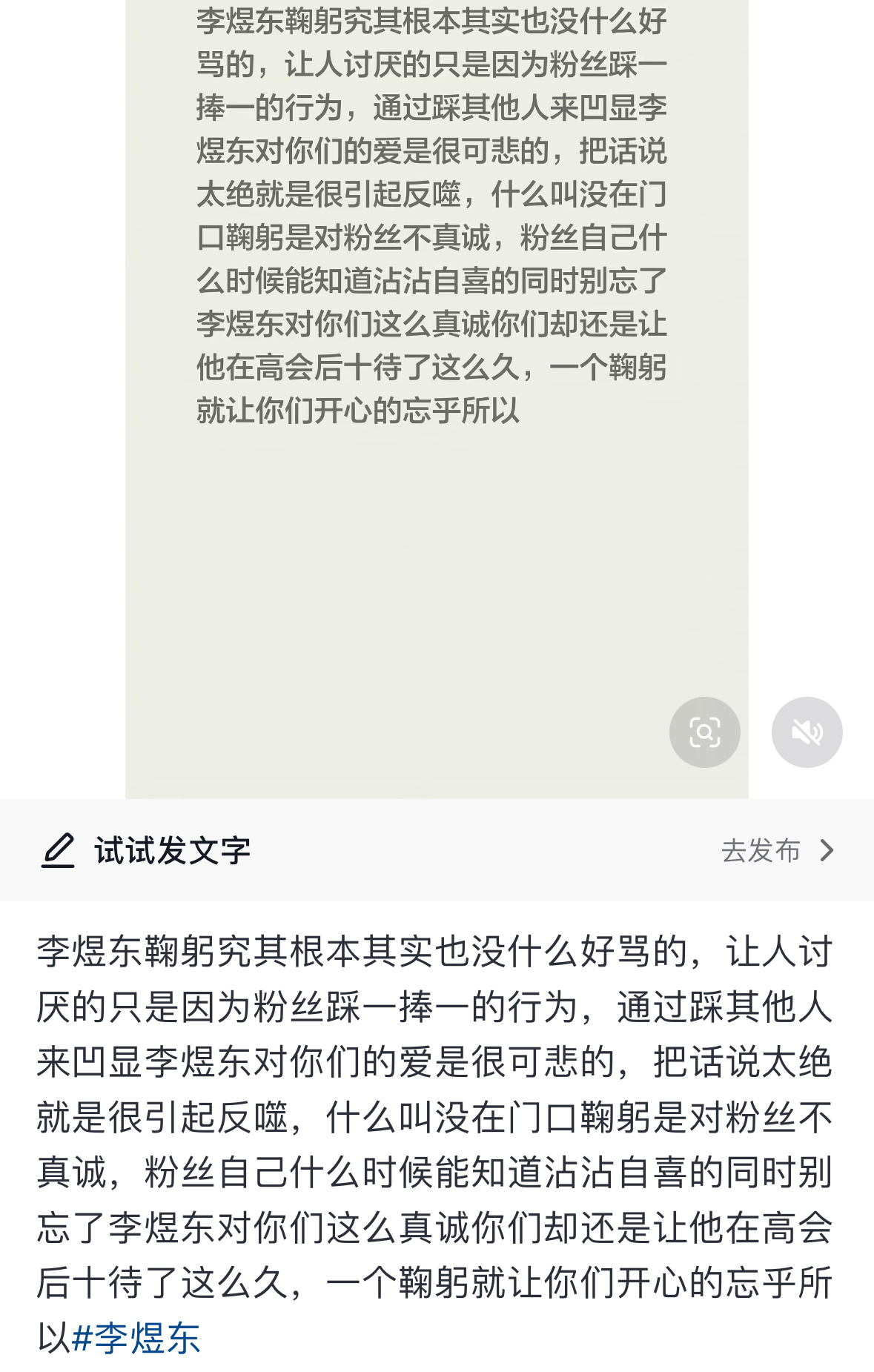 先搞清楚是谁先开始的,李煜东鞠完躬后,东毛都在忙着感动忙着表达爱意,而tss却急得跳脚,在豆瓣微博小红书抖音几个平台齐刷刷黑帖起高楼,举都举不完。我们一直强调了每个人表达爱的方式是不一样的,爱不是比赛,从来没有将其他人架起来表达爱意。从始至终,把你们的孩子架起来的,贷款焦虑的,只有你们自己。