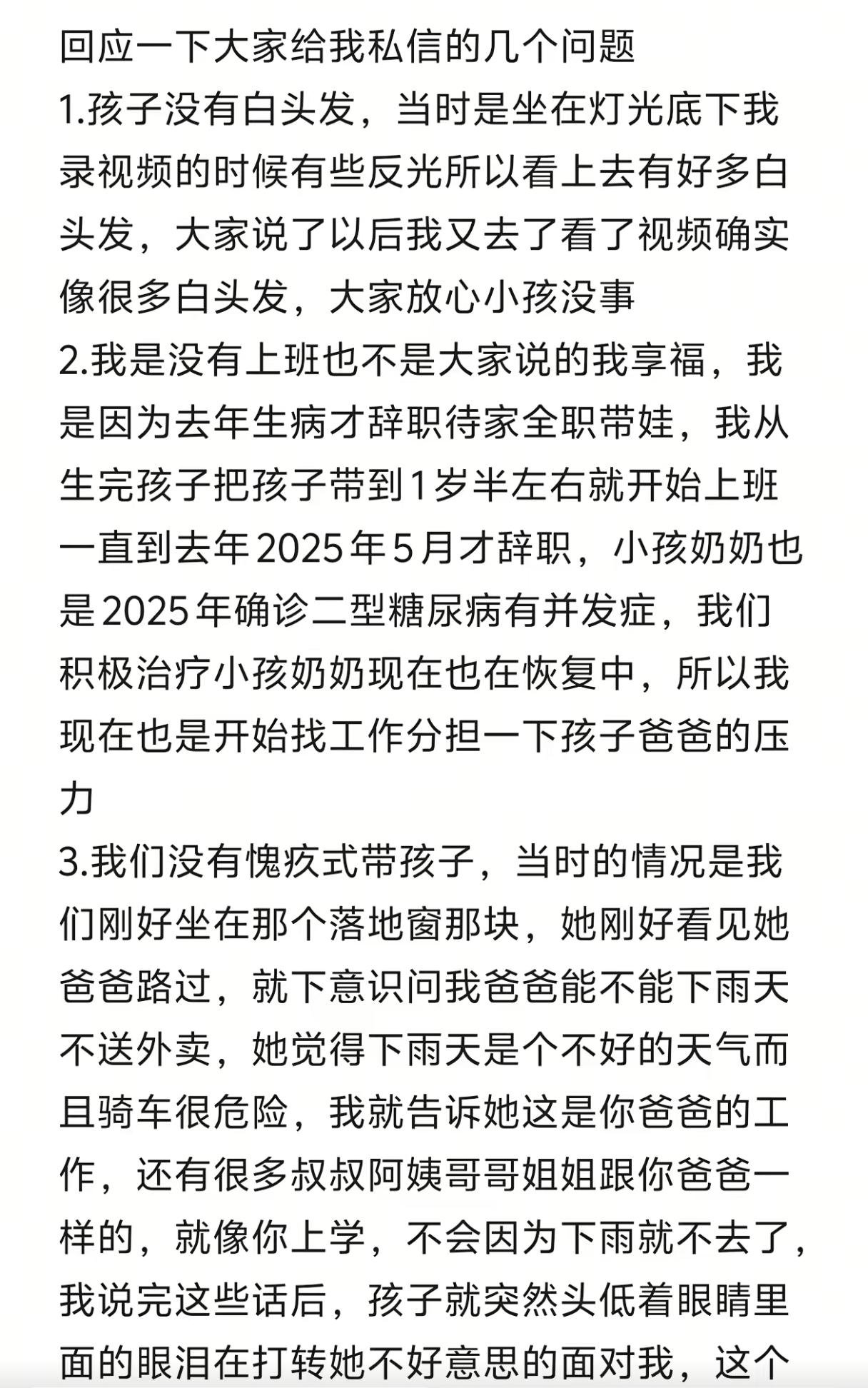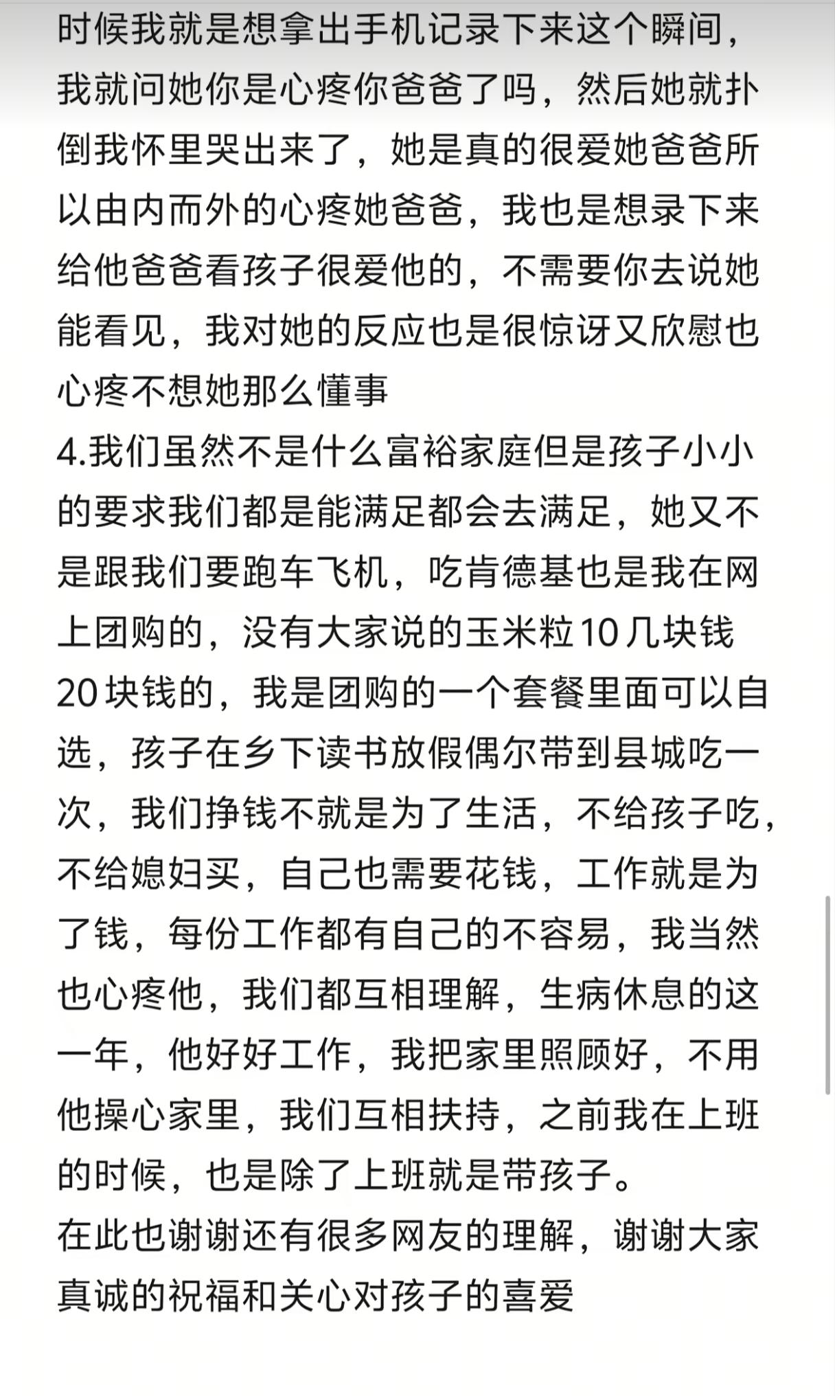 爸爸雨中送外卖,7岁女孩和妈妈吃肯德基却遭指责,妈妈委屈的解释:“肯德基是在网上团购的套餐,孩子在乡下上学,放假偶尔才去县城吃一次,自己也是因为去年生病才辞职在家全职带娃的。” 7岁女孩放假,妈妈带她到县城里去吃肯德基,孩子还带上了作业,坐在了落地窗旁。 正吃着肯德基,孩子偶然间往外看时,正巧看到了自己爸爸在冒雨送外卖,孩子愣了一下问妈妈:“爸爸能不能下雨天不送外卖?” 妈妈对此也耐心的做出了解释说:“这是爸爸的工作,还有很多叔叔阿姨跟爸爸一样的,就像你上学,不会因为下雨就不去了,而且爸爸的工资比一般人还要高呢!” 哪知道孩子听完,眼泪汪汪的,嘴里的玉米粒也不香了,立马趴到了妈妈怀里难过的哭了。 妈妈本来就是随手记录下来,想给孩子爸爸看看女儿有多爱他,没想到放到网上后却遭到了大量网友的指责。 有网友说:“你老公送外卖,你还舍得吃肯德基”、“没事少和孩子说家里的困难,孩子会变得敏感多疑”、“共情能力太强的孩子长大会很辛苦”…… 女孩妈妈也很委屈,本来只是随手记录生活,没想到却惹来网友那么多的争议。 她解释说,自己是去年5月份生病才辞职的,那时孩子奶奶也病了,所以自己暂时才没上班,之前一直都在上班。 现在孩子奶奶也在恢复中,自己已经开始找工作帮爸爸分担点压力了。 平时也没有“愧疚式”带娃,只是孩子平时就很爱爸爸,所以很心疼爸爸! 自己虽然不是什么富裕家庭,但平时孩子的要求能满足就尽量满足,肯德基是在网上团购的套餐,没有很贵,也不是经常吃,孩子在乡下上学,放假才带来吃一次! 孩子心疼爸爸,回家时候还给爸爸带了汉堡,爸爸看到视频后,既心疼又自豪! 很多网友说孩子太共情了不好,但共情的又不是别人,那是自己的爸爸,难道不应该吗? 觉得让孩子知道爸爸赚钱不容易,孩子会自卑,这点我是不太赞同的,孩子的自卑与否,跟家庭经济条件没有很大的关系,主要的是跟父母平时对待生活的态度有关系。 如果孩子父母是积极乐观、热爱生活的,那孩子不会自卑,懂得了父母的辛苦后,反而会更加努力! 孩子嘛,会心疼父母不容易是好事,父母要引导孩子,不让她觉得愧疚就好了,大家真没必要这么指责人家!