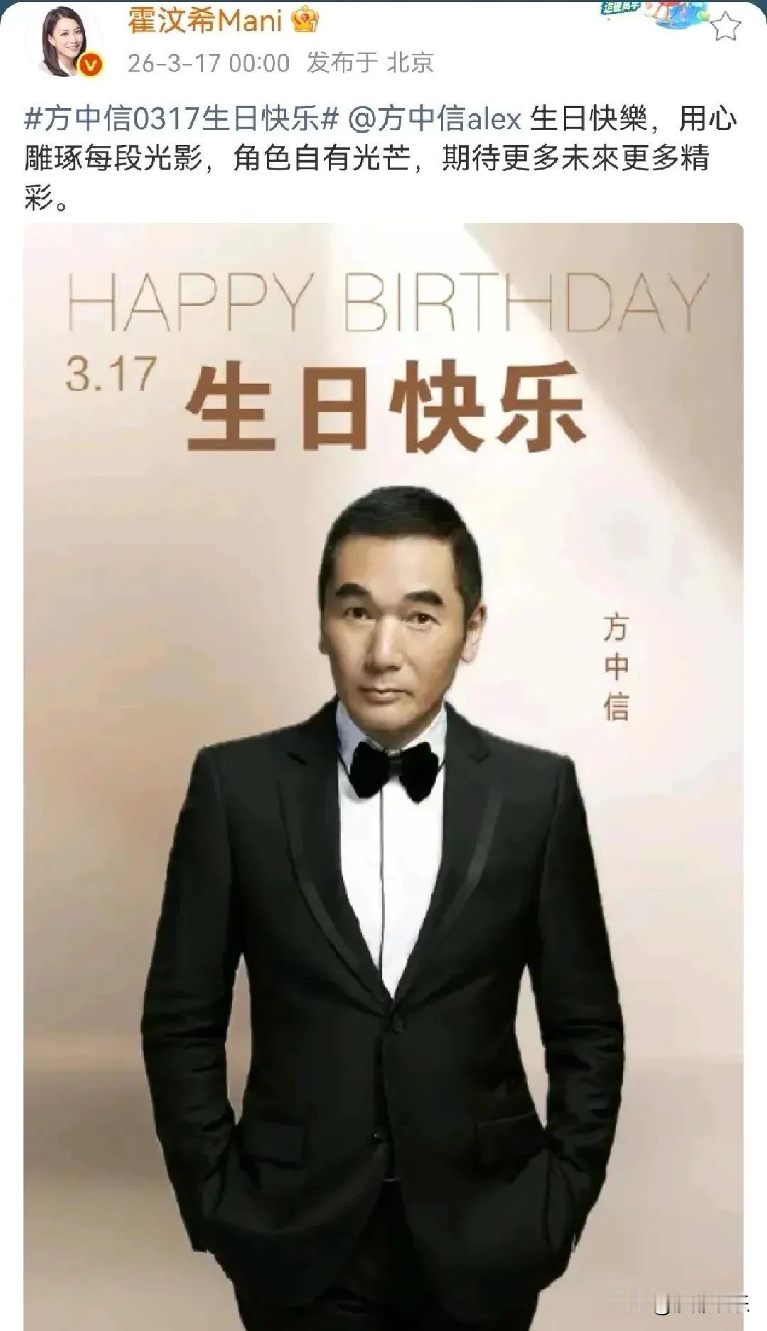 谢霆锋经纪人,凌晨激动发文! 3月17日刚过00:00,娱乐圈的“金牌推手”霍汶希就准时上线,卡点为自家艺人送上了生日祝福。这次的主角,是迎来了63岁生日的戏骨方中信。 一句“用心雕琢每段光影,角色自有光芒”,不仅道出了霍汶希对这位老友的欣赏,更瞬间把网友拉回了那些年被港剧支配的青春回忆里。 霍汶希这次的发文可不是简单的客套。作为英皇娱乐的掌舵人,她与方中信的情谊早已超越了冰冷的经纪合约。除了是经纪人,霍汶希还曾以总制片人身份,与方中信在网剧《机动部队》中深度合作。看着他在剧中塑造铁面无私的警长刘建晖,这份“战友”情,一般人真比不了。 要说这次庆生最打动人的,其实是两个字——“患难”。 在娱乐圈这个名利场,大多数关系都是“同甘易,共苦难”。但霍汶希和方中信显然是个例外。很多年轻观众可能不知道,当年方中信深陷代言风波,被合作9年的品牌方突然“炒鱿鱼”甚至发声明指责时,场面一度非常难看。 当时面对外界的质疑,第一时间站出来灭火的不是别人,正是霍汶希。她不仅迅速发声明澄清事实,表示当中存在误会,更硬气地维护自家艺人:合约内的事我们尽责,合约外的事艺人有权拒绝。这种“凡事留一线,日后好相见”的公关智慧,加上对艺人原则的尊重,让当年的舆论瞬间倒戈,纷纷为方中信打抱不平。如今再看霍汶希的卡点庆生,那不仅是对成绩的肯定,更像是一种无声的宣言:风雨中走过,我依然挺你。 在流量更迭比翻书还快的时代,很多经纪公司和艺人撕破脸的戏码每天都在上演。但英皇娱乐似乎总有一种老派的温情。霍汶希的这次发文,表面是生日祝福,实则是给英皇做了一次价值连城的品牌宣传——你看,我们连63岁的老戏骨都当作宝贝,我们会亏待年轻人吗? 方中信从《旺角黑夜》提名金像奖影帝,到《又见一帘幽梦》里温柔的费云帆,再到《芈月传》中霸气的嬴驷,四十年来用作品说话。这种艺人与公司之间的相互成就、彼此托底,才是港圈能持续输出好演员的真正底色。 63岁依然活跃在一线,有戏拍,有老友记挂,方中信这状态,简直赢麻了!