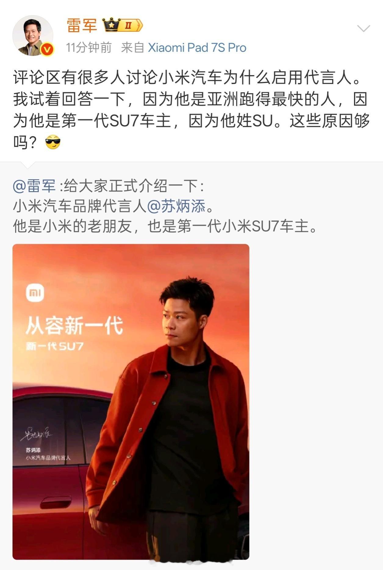 小米代言人选的没毛病苏神就是SU7的“活招牌”这波是真·强强联合! 苏炳添官宣代