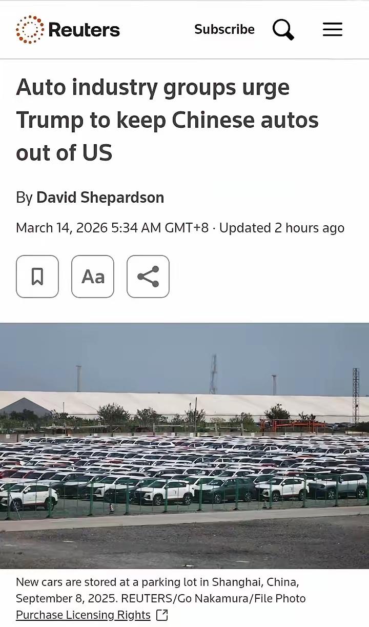老美,这次真的被打怕了! 根据路透社消息,老美那边几大汽车协会强烈要求不要让中国汽车公司到美投资,即使是合资设厂也不接受,更不要说汽车出口了! 为啥老美这么怕呢?中国汽车的竞争力太强肯定是主要原因,目前来看中国汽车所到之处几乎“无敌”,即使是在最难啃的小日子市场,比亚迪也啃下一块肉了! 更让老美坐不住的是,中国汽车不是单纯拼数量,而是拼硬实力、拼性价比,所到之处几乎 “无敌”,就连全球最封闭、最难啃的日本市场,都被比亚迪硬生生撕开了口子。 日本可是丰田、本田的大本营,向来对中国产品设高门槛,可比亚迪偏不信邪,2022 年进入日本乘用车市场后,一路势如破竹:2024 年比亚迪纯电动车销量2223 辆,首次超过丰田纯电动车销量;2025 年全年销量达到3870 辆,同比增长62%。 到了 2026 年 2 月,单月销量就达466 辆,同比暴涨110.9%,其中海狮 06 DM-i 这款插混 SUV 贡献了近四成销量,订单交付周期都排到了数月之后。 这事儿放在整个全球车市里看,才更能明白老美为啥慌了神。日本汽车进口商协会3月5日刚公布的数据就摆在这儿:2月日本进口车销量同比降了6%,连续两个月下滑,可纯电动车销量逆势涨了43%,占了进口车总量的15%。就在整个市场收缩的时候,比亚迪466辆的销量不仅没掉队,还比去年同期翻了一倍多,是唯一一个增长翻倍的非德系品牌。 网友们聊起这事儿,观点特别直接:有人说“这不是逆袭,是降维打击”,毕竟比亚迪海狮06 DM-i在日本起售价才398.2万日元,比同级丰田RAV4 PHV便宜了150万日元左右,配置还更实在;也有人吐槽“日系车的护城河被自己填了”,毕竟日本消费者早就受够了高油价、高用车成本,比亚迪插混百公里油耗低至3升多,一周通勤不用充电也够跑,刚好戳中痛点。更有意思的是,还有网友注意到,比亚迪没硬拼高端路线,先靠5款常规车型站稳脚跟,夏天还要推专门为日本K-Car政策打造的纯电车型“海獭”,这本土化思路太聪明了。 老美汽车协会的联名信,说白了就是底气不足的表现。他们怕的不只是比亚迪在日本的成绩,更是中国汽车的硬实力——近80%核心零部件自研,单台海豹比特斯拉Model 3省2369美元,刀片电池、智能座舱技术都走在世界前列。更让他们坐不住的是,中国出口车均价才1.9万美元,美国本土车却要5.1万美元,差价超3万,消费者又不傻,谁会放着便宜又好用的不选? 更关键的是,老美自己还自顾不暇。通用、福特在华销量一路下滑,可中国汽车早就悄悄渗透美国市场,2024年卖了超8万辆。他们想靠关税壁垒、技术红线封锁,可根本没用——加拿大已经把中国电动车关税从100%降到6%,中国汽车完全能借着美墨加协定间接进入美国市场。况且美国车企早就和中国产业链深度绑定,宁德时代、华域等企业都在为其供货,封杀中国汽车,说白了就是砸自己的脚。 这背后其实是一场必然的产业变革。电动化、智能化浪潮下,谁能跟上技术节奏、把控性价比,谁就能赢得市场。中国汽车靠产业链优势、技术创新和本土化策略,一步步打破了老牌车企的垄断,这不是“威胁”,是市场竞争的必然结果。 老美现在的操作,本质是用行政手段掩盖自身竞争力的不足。可市场从来不是靠封锁就能守住的,就像比亚迪在日本的增长一样,消费者只会用脚投票。接下来中国汽车还会在更多市场发力,老美这种“堵不如疏”的心态,早晚会被市场狠狠教育。老美战斗力 对美企制裁 老美大使馆 美对华出口汽车 老美军工公司 美车企 美国汽车工业 日美汽车博弈 你觉得中国汽车接下来能在欧洲市场复制日本的成功吗?欢迎在评论区聊聊你的看法~