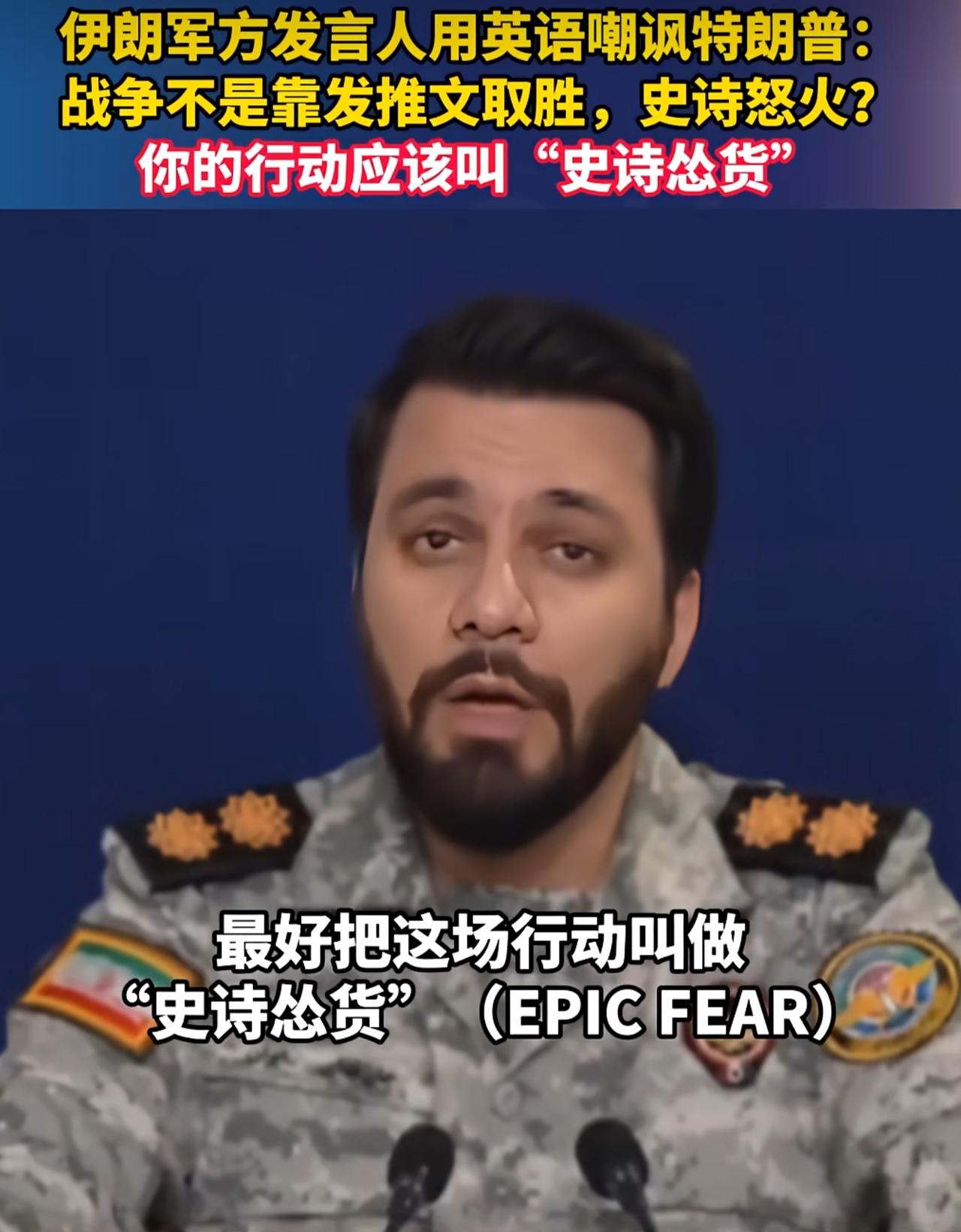 伊朗武装部队发言人开嘲讽了,他用英语公开喊话特朗普:“发推不能决定战争的结果,战争的结果是在战场上决定的,你和你的军队没有胆量涉足的战场,而你只敢在网上谈论战场,最好把这场行动叫史诗怂货,而不是史诗怒火。”特朗普你的海军陆战队在哪儿,不是要占领哈尔克岛吗?你可是有史以来最伟大的美国总统,不能怂啊!