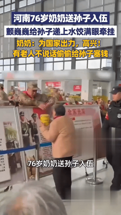 3月16号的河南许昌,天刚蒙蒙亮,武装部的院子里就飘起了饺子香。76岁的奶奶踮着脚在人群里找,看见穿军装的孙子时,手里的保温桶差点没端稳。 “慢点吃,烫!”她把筷子塞到孙子手里,饺子一个个圆滚滚的,皮儿薄得能看见里面的馅儿。孙子刚咬一口,奶奶就别过脸抹了把眼角,转过来又笑:“哭啥?咱娃去为国家出力,是光宗耀祖的事!”可声音里的颤音,藏不住那满心的牵挂。 旁边的爷爷一直没咋说话,就直勾勾地盯着孙子胸前的大红花,那眼神里全是骄傲。等要上车的时候,他突然拽住孙子的手,往他兜里塞了个用手帕包着的东西,拍了拍他的胳膊,就扭头走了。后来孙子才发现,那是爷爷攒了小半年的烟钱,一张一张叠得整整齐齐。 其实啊,咱中国人的感情就是这么实在。老人嘴上说着“高兴”,可心里比谁都舍不得;手里递着饺子,兜里塞着钱,把所有的疼惜都藏在这些不起眼的小事里。就像网友说的,那胸前的大红花是给国家的承诺,长辈给的这点“实在”,是给孩子最暖的后盾。 想想谁家还没个这样的长辈?他们不咋会说漂亮话,可对你的好,全在行动里。你身边有这样让人暖心的故事吗?来评论区聊聊,也给这懂事的孩子和疼人的长辈点个赞,让更多人看看这藏在烟火里的深情。 河南76岁奶奶送孙子入伍饺子里裹着最沉的骄傲 最动人的牵挂藏在细节里 信息来源:大象新闻