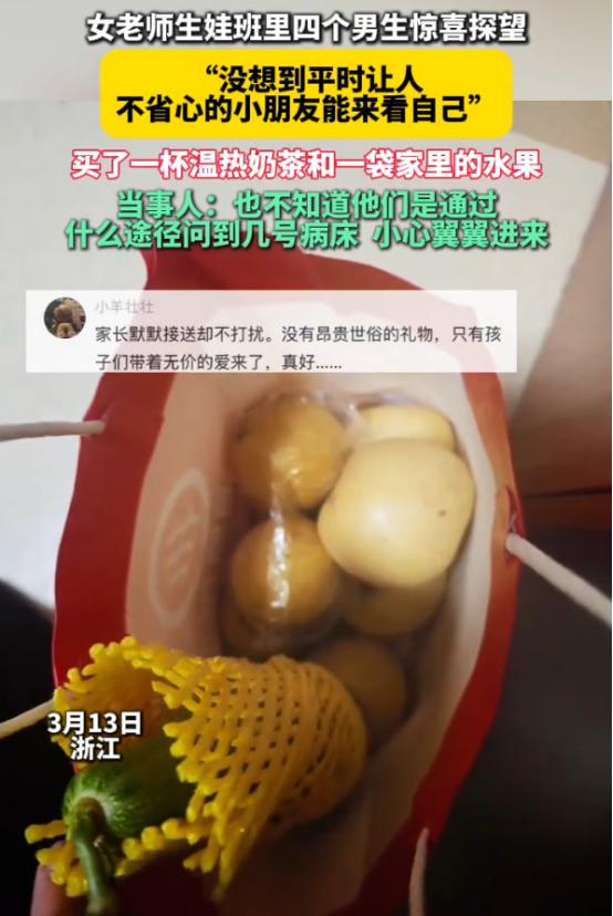 泪目了!浙江嘉兴,一名女老师怀孕生子后在医院病房休息,没想到,班里四名男生竟然悄悄找了过来,而这四名男生,既不是班里的干部,也不是学习成绩好的孩子,反倒是平时最不省心的几个。网友:成绩永远不是衡量一个人的标准。 “老师?我们终于找到你了!”病房门被推开一条缝,四个小脑袋挤在那,最前面的那个喘着粗气,脸冻得通红。 这一幕,发生在浙江嘉兴某医院。彼时,刚生完孩子才两天的女老师正靠在床上休息,一抬头,愣住了。 这不是她班上那几个最让人头疼的孩子吗? 说起来,这四个男生在班里可没少让她操心。作业拖拉的是他们,上课说话的也是他们,课间追跑打闹被扣分的还是他们。 先不说成绩好不好,光是这几个孩子出现在在老师办公室的频率,就很让人头疼了。可偏偏就是这么几个“不省心”的孩子,不知道从哪打听到老师生了宝宝,放学后结伴摸到了医院。 他们没有具体病房号,就一层一层地问;手里捧着一杯热奶茶和一袋子水果,可能是几个人凑零花钱买的。3月的天气算不上暖和,但奶茶送来的时候,还是热的,或许是孩子们怕凉,一路捂着过来的。 老师的丈夫回来后撞见这一幕,也十分感动。几个孩子刚开始还有点不好意思,你推我我推你,可没聊几句就憋不住了,开始跟老师汇报起来:班里最近谁和谁吵架啦,代课老师布置了什么作业啦,叽叽喳喳说个没完。 老师靠在床头听着,笑着笑着眼眶就红了。 这件事被报道后,大家感到暖心之余,也不由的思考:我们总说教育是良心活,可真到评一个孩子的时候,又总是绕不开分数和纪律。 而这四个孩子用行动证明了一件事:他们可能记不住课文,但记得住老师的好;可能听不懂复杂的公式,但听得懂老师嗓子哑了还在坚持讲课。 有网友说得特别实在:“这些懂的感恩的孩子,怎么不算是好学生呢?在老师的职业生涯中,能收到这样的回音,值了!” 临走时,四个孩子还一步三回头,嘱咐老师好好休息。老师目光温柔的目送孩子们离开,转头看了看身边熟睡的宝宝,那一刻她突然明白了什么叫“教书育人”。 教书是手段,育人是目的。而育人这件事,往往要等到很多年后,才能从那些你意想不到的地方,收到回音。 对此你有什么看法?欢迎在评论区留言讨论。正能量 致敬 信息来源: 热点新闻2026-3-16|老师生娃 班里四个男生惊喜探望 文|墨海 编辑|史叔