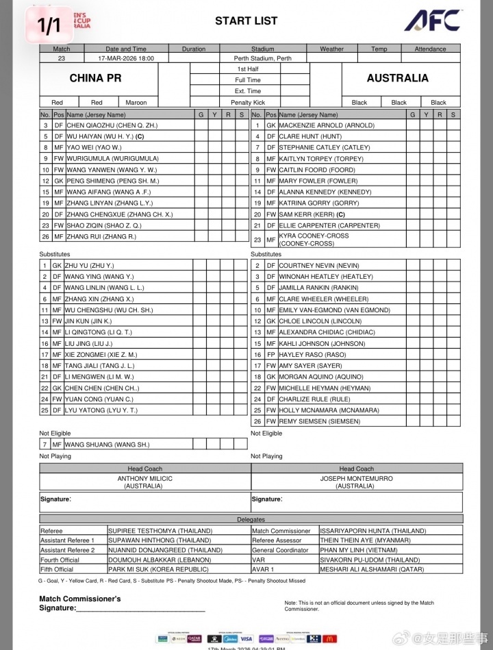北京时间今晚18点,女足亚洲杯半决赛,中国女足对阵东道主澳大利亚女足,赛前双方公布首发阵容。中国女足头号球星王霜因累计黄牌停赛,无缘参加本场比赛。