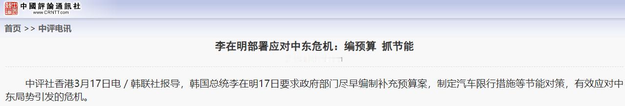 韩国撑不住,李在明做出一个重大决定。   韩国总统李在明3月17日表示,如果中东危机持续下去,必须考虑能源方面的最坏情况,并呼吁外交努力集中于为韩国寻找稳定的替代能源。李在明还在电视直播中表示,如有必要,韩国应考虑限制能源出口,但他没有详细说明。 韩国是个资源特别匮乏的国家,国内几乎没有什么石油、天然气,平时老百姓开车、做饭,工厂开工、发电,用到的能源,绝大部分都得从国外进口。 根据韩国官方的数据,他们大约70%的石油、20%的液化天然气,都来自中东地区,也就是说,中东那边的能源供应,直接牵着韩国的“命根子”。 最近一段时间,中东危机一直没平息,局势越来越紧张,这可把韩国急坏了。中东一乱,能源运输就变得不稳定,石油、天然气的价格也一个劲地涨。 就拿最近来说,布伦特油价已经涨到了100多美元一桶,单月涨幅超过40%,韩元也跟着大跌,跌到了近18年来的低位。这直接导致韩国国内的油价、气价跟着涨,老百姓加油更贵了,工厂的生产成本也大幅增加,连带着整个国家的经济都受到了很大影响。 更让人担心的是,中东的危机如果一直持续下去,韩国可能会面临能源供应中断的风险。要知道,韩国现在的石油储备,勉强能维持208天,而液化天然气储备,只能维持9天,一旦中东那边停止供应,韩国用不了多久就会陷入能源短缺的困境,到时候工厂可能停工,老百姓的正常生活也会受影响,后果不堪设想。 正是在这种紧急情况下,李在明才不得不做出重大决定,在电视直播中明确表态,要是中东危机一直持续,必须提前做好能源方面的最坏打算,不能等到真的断供了才手忙脚乱。 他首先强调,韩国的外交部门要把重点放在找替代能源上,赶紧和其他国家沟通协作,寻找稳定的能源供应渠道,甚至要找不经由霍尔木兹海峡的运输路线,避免被人卡脖子。 要知道,以前韩国的能源几乎全靠中东,现在主动找替代能源,就是怕中东那边出问题,自己没有退路。 毕竟现在中东局势不明朗,多找一个供应渠道,韩国就多一份保障,老百姓也能少一份担心。李在明还说,会加强和战略合作国家的协作,就是希望能尽快打通新的能源进口渠道,缓解目前的压力。 除了找替代能源,李在明还提到了一个重要决定,那就是如果有必要,韩国会考虑限制能源出口。虽然他没有详细说明,到底要限制哪些能源、怎么限制,但意思很明确,就是要先顾着国内的需求,把有限的能源留给自己人用,不能再像以前那样随意出口,避免国内出现能源不够用的情况。 其实这也能理解,现在韩国自己都快不够用了,自然要优先保障国内。而且韩国之前也有过类似的举措,比如最近已经开始实施石油价格上限制度,给炼油企业的石油产品设置价格上限,这也是近30年来韩国第一次这么做,足以看出情况的紧急。 除此之外,李在明还明确表示,韩国必须尽快大力发展可再生能源。这并不是他一时兴起,而是早就有规划的事情。一直以来,韩国的能源主要靠化石燃料和核电,可再生能源比如太阳能、风能,占比还很低,大概只有10%多一点。 而且之前尹锡悦政府还削减了可再生能源的预算,导致光伏装机量下滑,现在李在明要加快发展可再生能源,就是想从根本上解决能源依赖进口的问题。 李在明之前就提出过“能源高速公路”计划,打算建海上风电项目,还要建跨区域的输电网,把可再生能源的电力输送到各个工业区和城市。 他还想通过补贴、简化审批等方式,鼓励企业投资可再生能源项目,甚至要打造“电池三角带”,发展储能产业,解决可再生能源不稳定的问题。毕竟只有自己能生产能源,才能真正摆脱对进口的依赖,不用再看别人的脸色。 可能有人会问,发展可再生能源不是一天两天能成的,为什么现在要急着提?其实道理很简单,中东危机让韩国彻底意识到,依赖进口能源太危险了,必须尽快找到长期的解决办法。 而且韩国多山地,大规模建光伏、风电确实有难度,成本也不低,但现在已经没有退路了,只能加快脚步,哪怕遇到困难,也要坚持推进。 李在明的这些决定,看似是应对当下的危机,其实也是为韩国的长期发展考虑。现在韩国的能源问题已经迫在眉睫,不做出改变,只会越来越被动。这些决定虽然不能立刻解决问题,但至少给韩国指明了方向,也让老百姓看到了政府解决能源问题的决心。 韩国这次之所以撑不住,核心就是能源太依赖进口,中东危机只是一个导火索。李在明做出的这些重大决定,都是没办法的办法,既要应对当下的紧急情况,保障国内能源供应,又要为长远考虑,摆脱进口依赖。