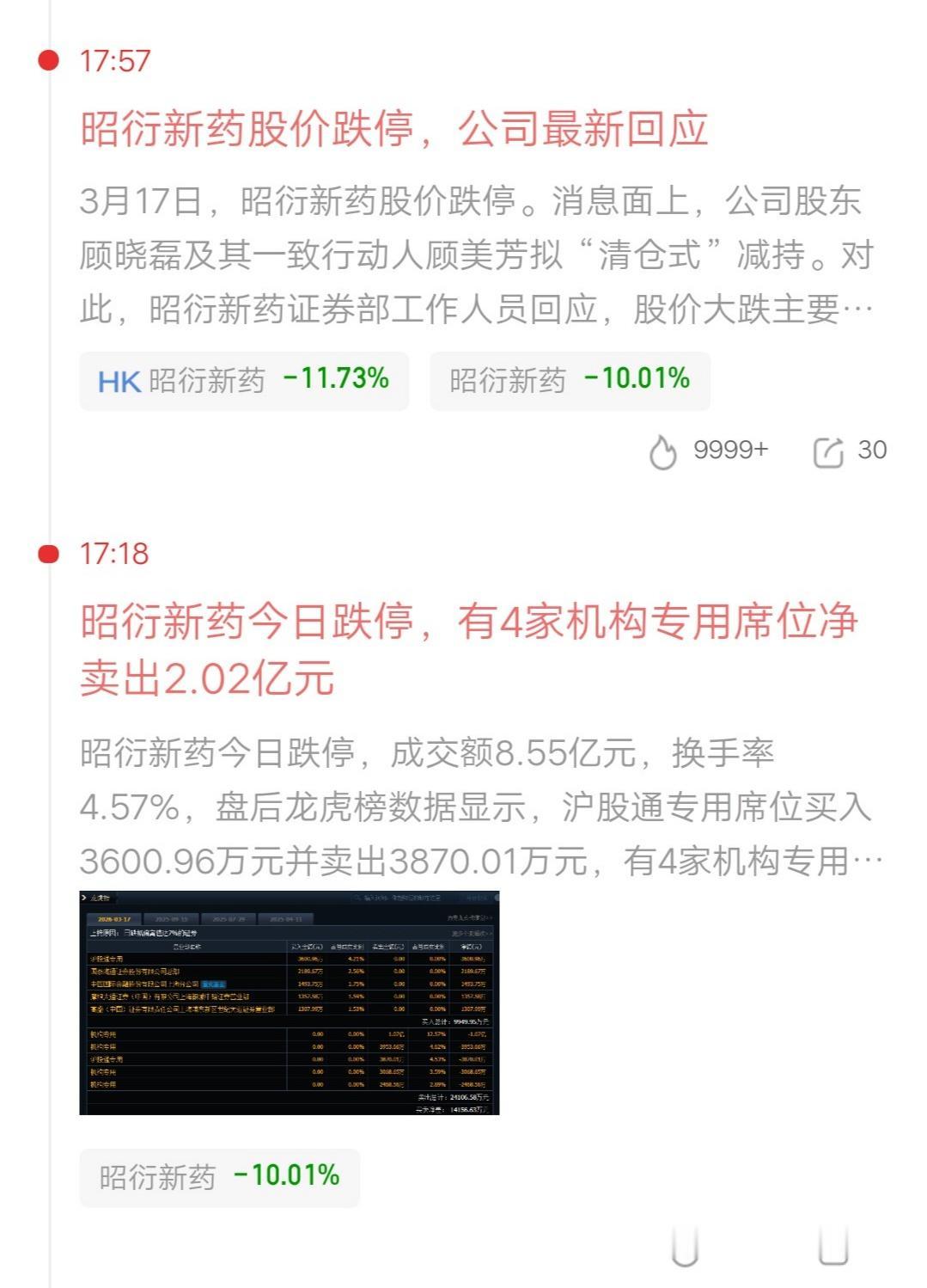 A股出现大股东清仓式减持,理由是自身资金需求。昭衍新药今日10cm跌停,机构合计卖出2亿多元。能让机构感到恐慌,说明这次减持力度很大。 股东顾晓磊及一致行动人顾美芳,拟减持不超过3074.25万股,占总股本4.1026%。这俩人把手中的股份,全卖光了,一股不留。他俩是2020年报进入十大股东的,如今持股六年了,现在兑现原因并不复杂,估计是判断牛市结束了,可以提现了。耐心等熊市再建仓,高抛低吸,轻松赚大钱,真让人羡慕。 昭衍新药属于医疗服务板块,是国内领先的药物研发外包(CRO)企业,核心是药物非临床安全性评价,同时覆盖临床、实验动物与其他评价服务 。 大资金的赚钱模式,极其简单,熊市买牛市卖,三年不开张开张吃三年。小散户们好好存钱吧,等熊市。