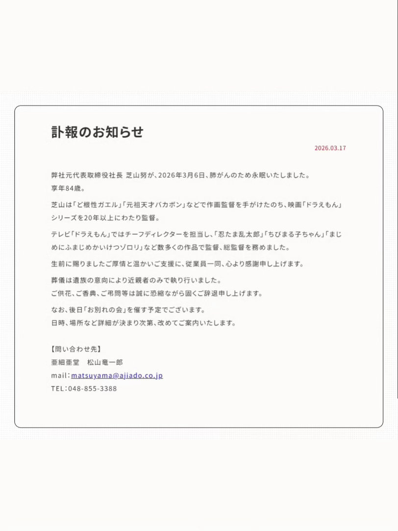 哆啦a梦导演芝山努去世 据日媒报道,日本著名动画导演、演出家芝山努于2026年3月6日因肺癌与世长辞,享年84岁。他的离去,带走了我们童年中那些最熟悉、最温暖的色彩。
