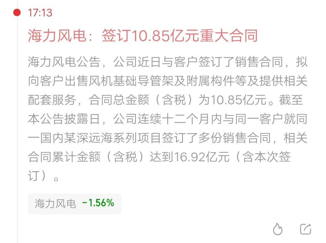 海力风电利好来了,1.89万股东有机会吃大肉啦。公司公告,签订10.85亿元重大合同,拟出售风电基础导管架及附属构件,还有配套服务。 股价低迷很久了,很多散户快扛不住了,此次利好就看主力给不给力了,拉一波行情,让散户回回血。 当然有利好并不代表一定会涨,要看市场如何反应。大A的现状很残酷,有利好资金才可能关注,没利好看都不看一眼,话糙理不糙呀。