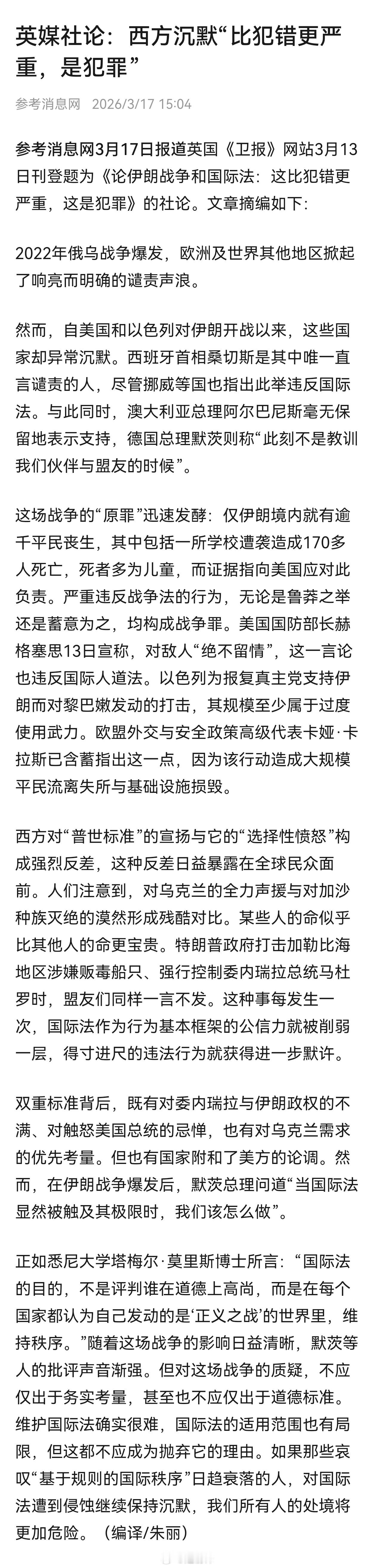 【英媒社论:西方沉默“比犯错更严重,是犯罪”】参考消息网3月17日报道英国《卫报》网站3月13日刊登题为《论伊朗战争和国际法:这比犯错更严重,这是犯罪》的社论。文章摘编如下:网页链接