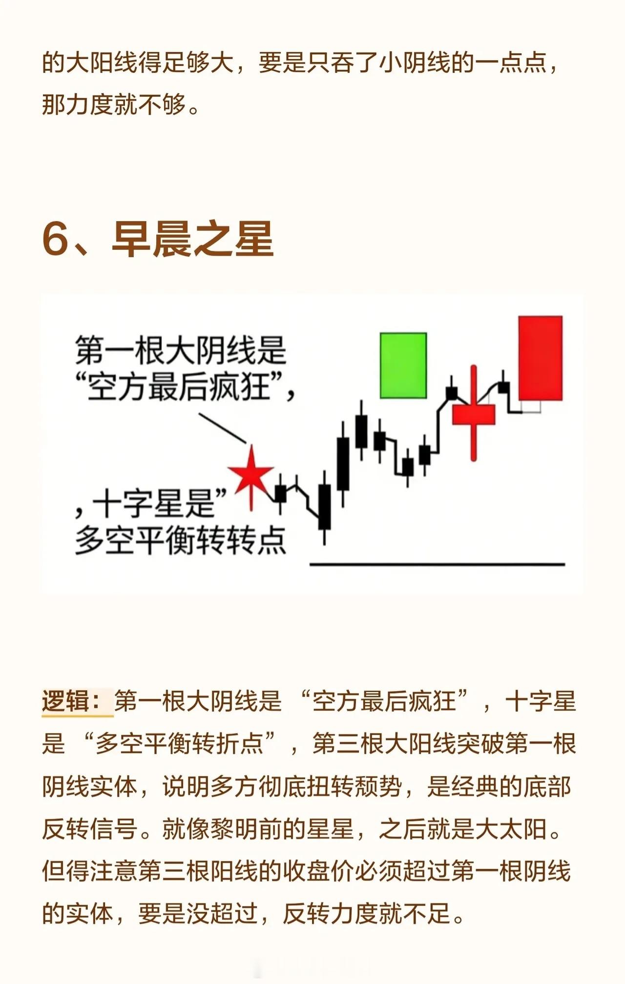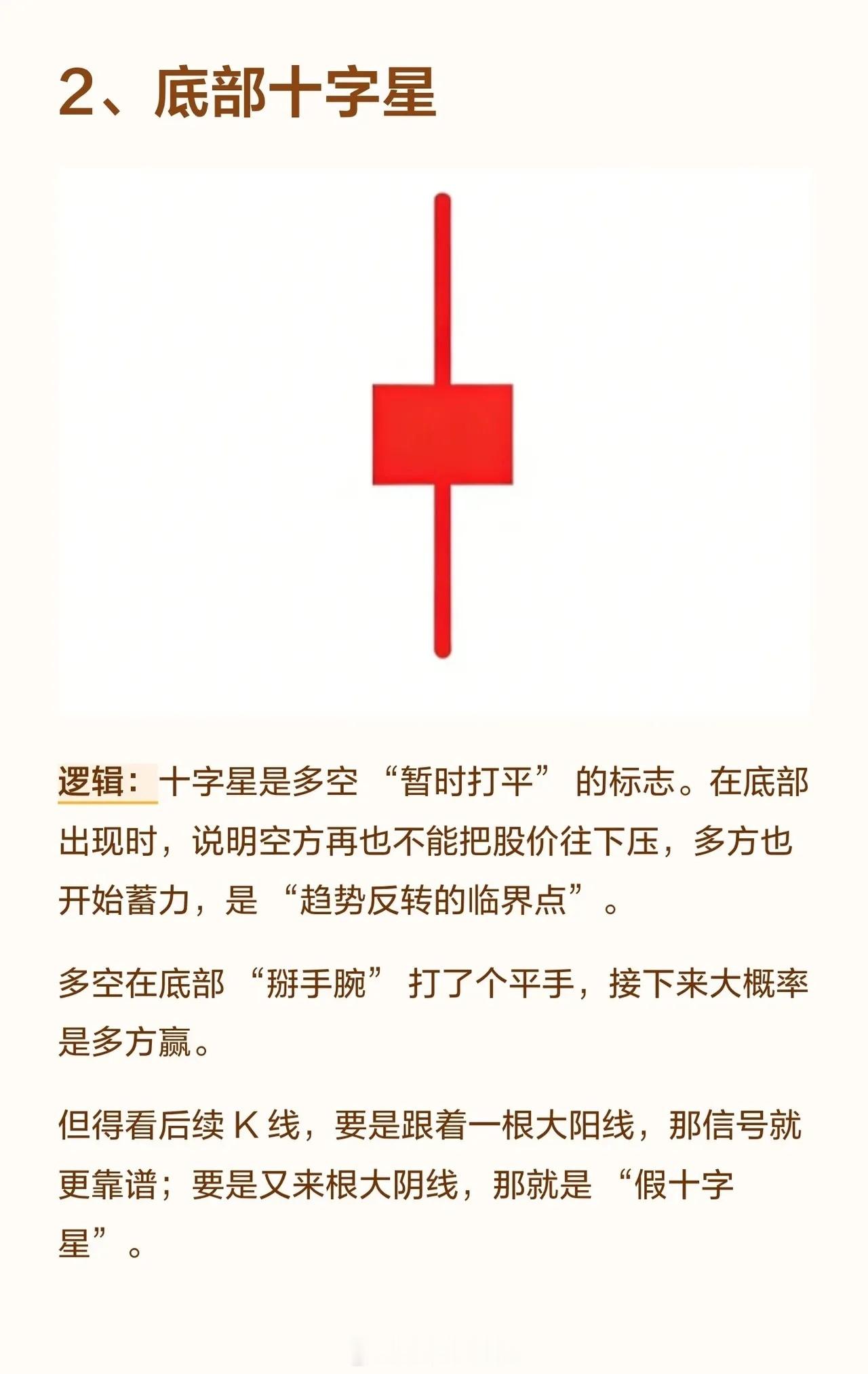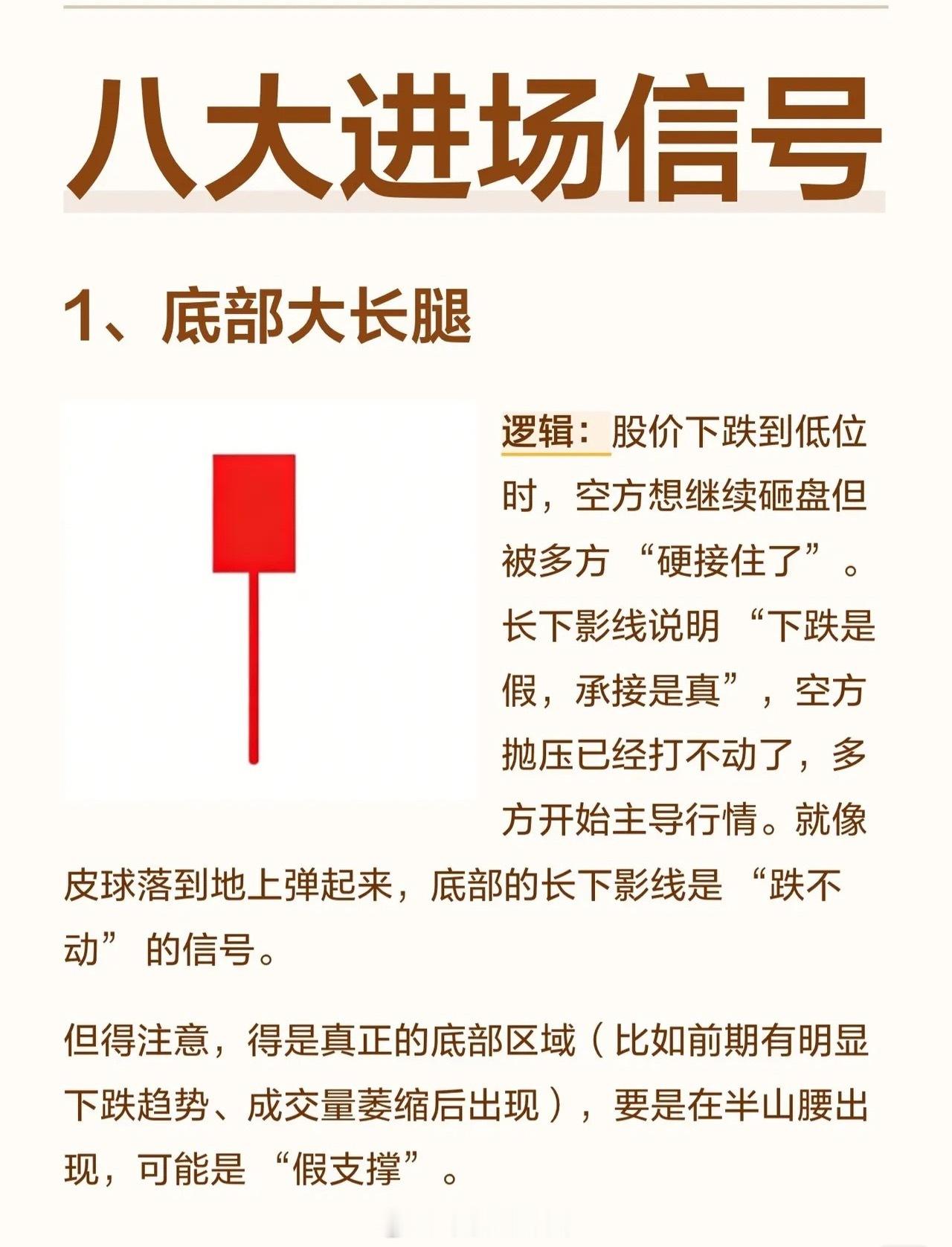 1. 底部大长腿在股价下跌至低位时出现,长下影线意味着空方砸盘被多方强势接住,表明下跌无力、承接强劲。这通常是“跌不动”的信号,但必须出现在真正的底部区域,若在半山腰则可能是“假支撑”。2. 底部十字星十字星是多空力量暂时打平的标志。在底部出现说明空方无法继续打压股价,而多方开始蓄力,是趋势反转的临界点。若后续跟随一根大阳线则信号更可靠,若跟随大阴线则为“假十字星”。3. 西装革履大阳线指没有上下影线的实体大阳线,表明多方从开盘到收盘完全碾压空方,是极强的多头控盘信号。该形态在底部或上涨初期出现是真强势,但在高位出现则可能意味着“诱多”。4. 两把锤子打桩两根锤子线形成“双重支撑”,下影线越长、实体越小,说明多方接盘意愿极强,空方抛压被消化。这就像打下两根地基桩,底部稳固。前提是两根锤子线的最低点相近,若第二根低很多则支撑力弱。5. 大阳包小阴小阴线是空方短暂反扑,大阳线直接吞没小阴线,说明多方完全掌控局面,空方反击被彻底碾压,是趋势由弱转强的明确信号。要求大阳线足够大,若只吞一点点力度则不足。6. 早晨之星由一根大阴线、一根十字星、一根大阳线组成。大阴线是“空方最后疯狂”,十字星是“多空平衡转折点”,第三根大阳线突破第一根阴线实体,表明多方彻底扭转颓势,是经典的底部反转信号。要求第三根阳线收盘价超过第一根阴线实体,否则反转力度不足。7. 大阴后两小阳大阴线是“空方全力宣泄”,之后的小阳线不创新低,说明空方“没力气再跌”,多方开始慢慢收复失地。要求小阳线站稳大阴线底部区间,若再跌回新低则是“假企稳”。8. 两阳线大炮第一根长阳打开空间,第二根长阳高开高走,表明多方强势进攻,是强势进攻信号,常见于整理末期或底部启动时。第二根阳线必须高开在第一根阳线收盘价之上,若低开则进攻气势减弱。