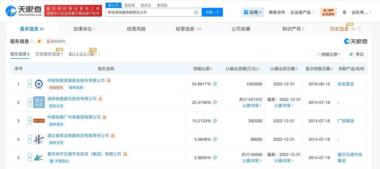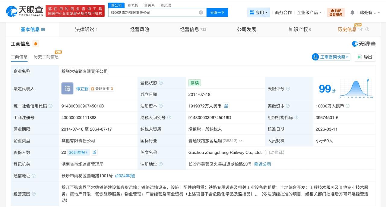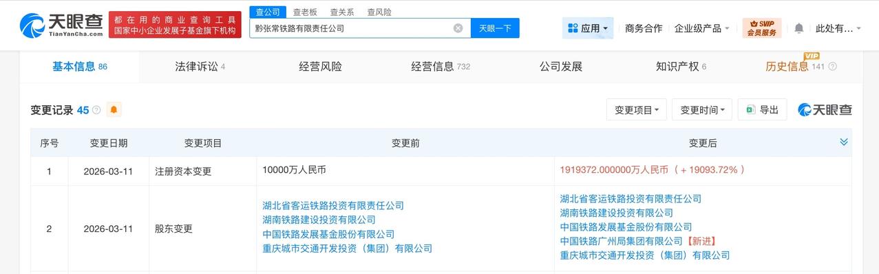 黔张常铁路公司增资至192亿 增幅约19094% 天眼查工商信息显示,近日,黔张常铁路有限责任公司发生工商变更,注册资本由1亿人民币增至约192亿人民币,增幅约19094%,新增中国铁路广州局集团有限公司为股东。 黔张常铁路有限责任公司成立于2014年7月,法定代表人为谭立新,经营范围包括黔江至张家界至常德铁路建设和客货运输、铁路运输设备设施配件的租赁等。股东信息显示,该公司由中国铁路发展基金股份有限公司、湖南铁路建设投资有限公司、湖北省客运铁路投资有限责任公司及上述新增股东等共同持股。 天眼查信息: