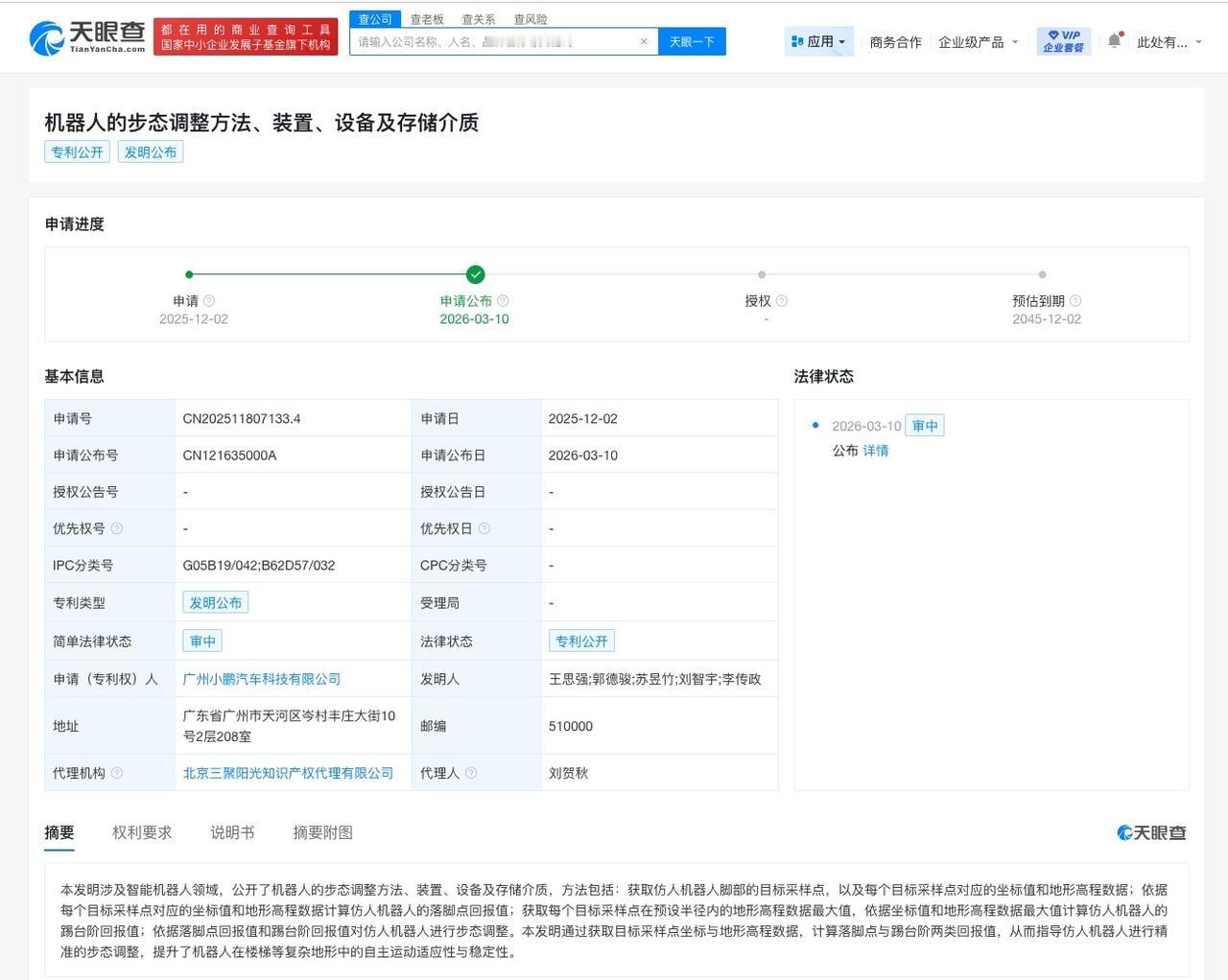 小鹏汽车公布机器人步态调整专利 可提升机器人在楼梯等复杂地形稳定性 天眼查知识产权信息显示,近日,广州小鹏汽车科技有限公司公布“机器人的步态调整方法、装置、设备及存储介质”专利。 摘要显示,本发明涉及智能机器人领域,方法包括:获取仿人机器人脚部的目标采样点,以及每个目标采样点对应的坐标值和地形高程数据;依据每个目标采样点对应的坐标值和地形高程数据计算仿人机器人的落脚点回报值;获取每个目标采样点在预设半径内的地形高程数据最大值,依据坐标值和地形高程数据最大值计算仿人机器人的踢台阶回报值;依据落脚点回报值和踢台阶回报值对仿人机器人进行步态调整。本发明通过获取目标采样点坐标与地形高程数据,计算落脚点与踢台阶两类回报值,从而指导仿人机器人进行精准的步态调整,提升了机器人在楼梯等复杂地形中的自主运动适应性与稳定性。 天眼查信息: