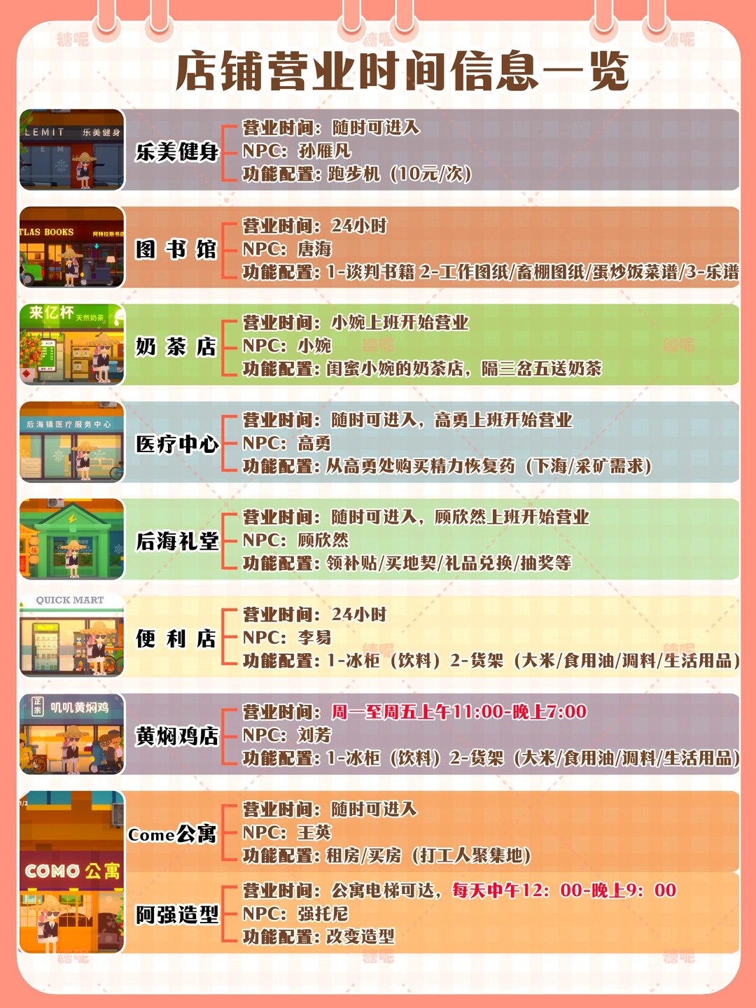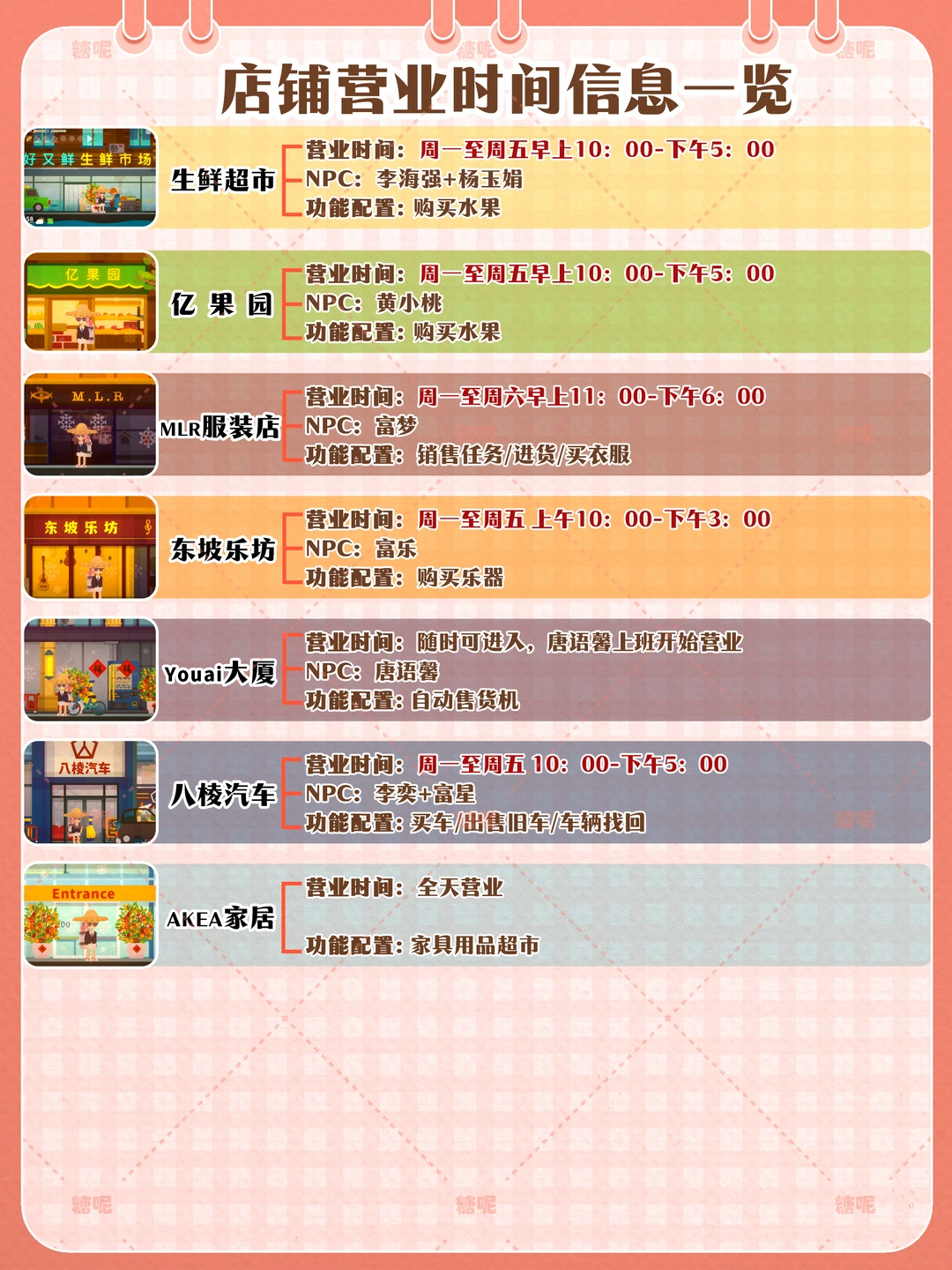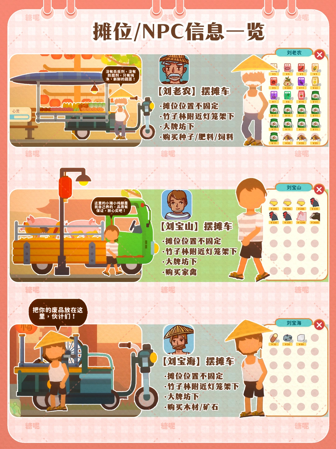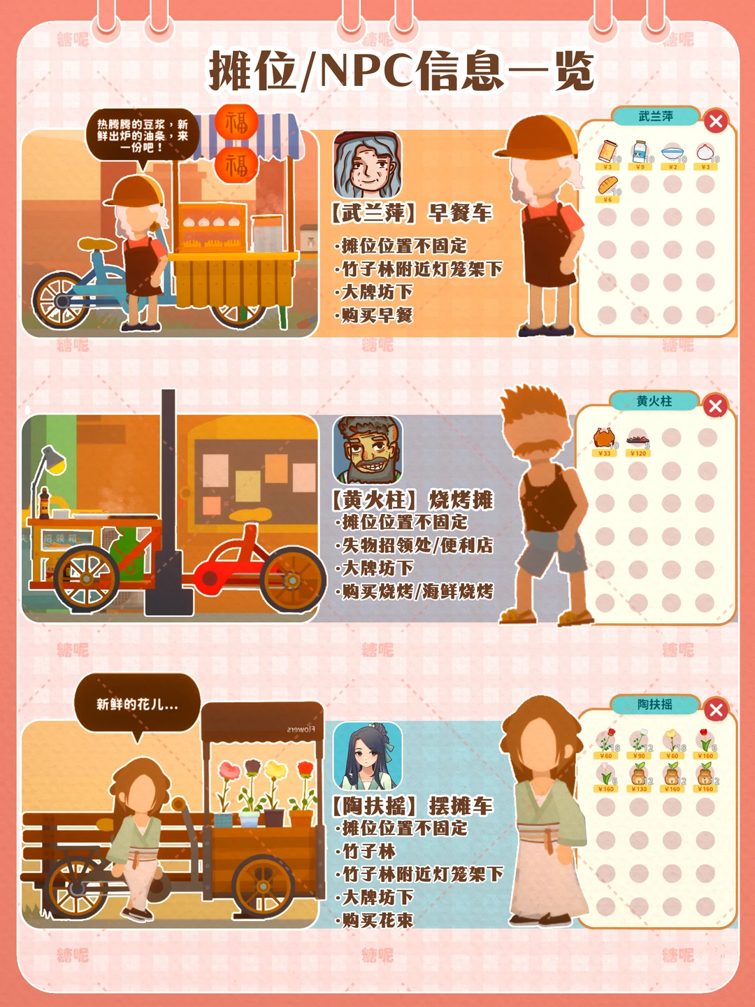1️⃣p2地图信息一览图:按游戏内从左往右,查看起来非常方便 2️⃣p3 p4店铺营业时间/信息一览图- 查看店铺的营业时间及信息 3️⃣p5 p6 不固定小摊NPC及信息