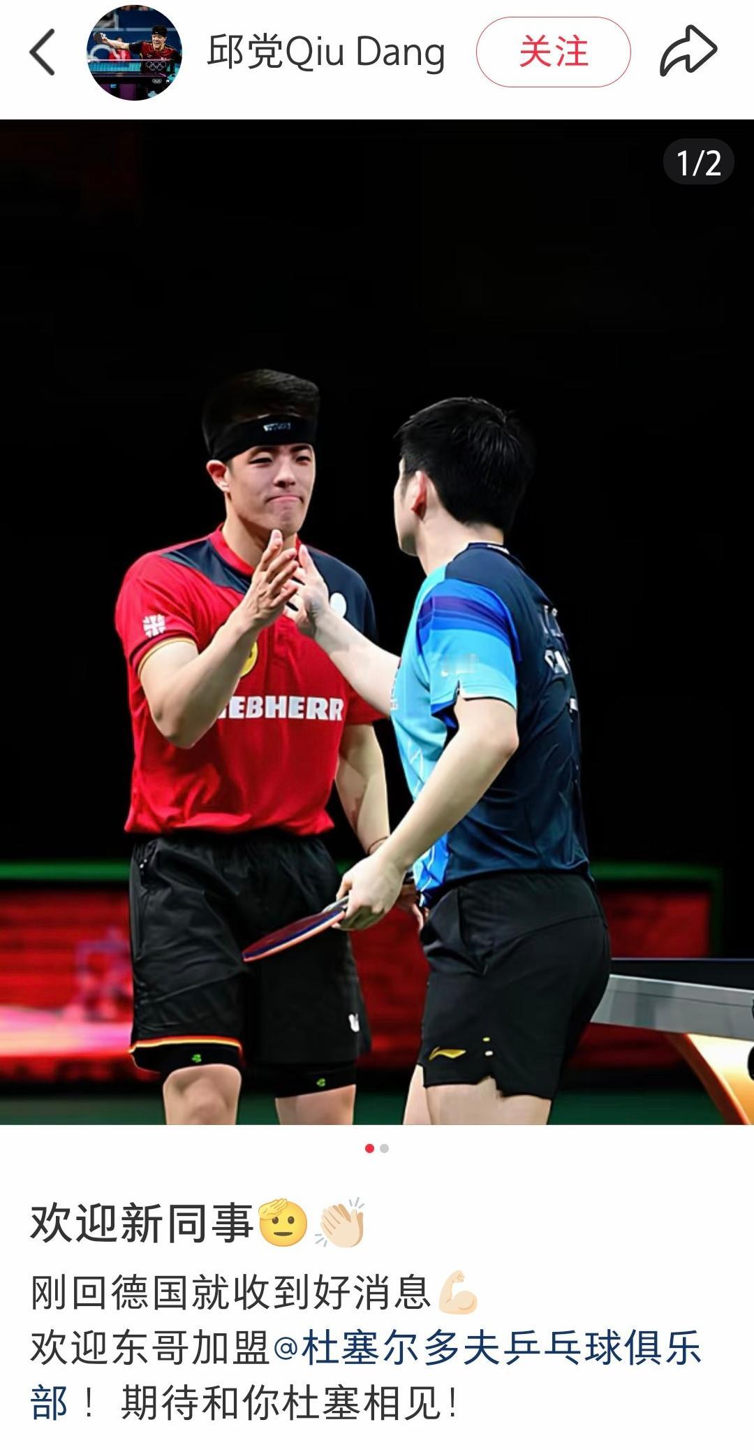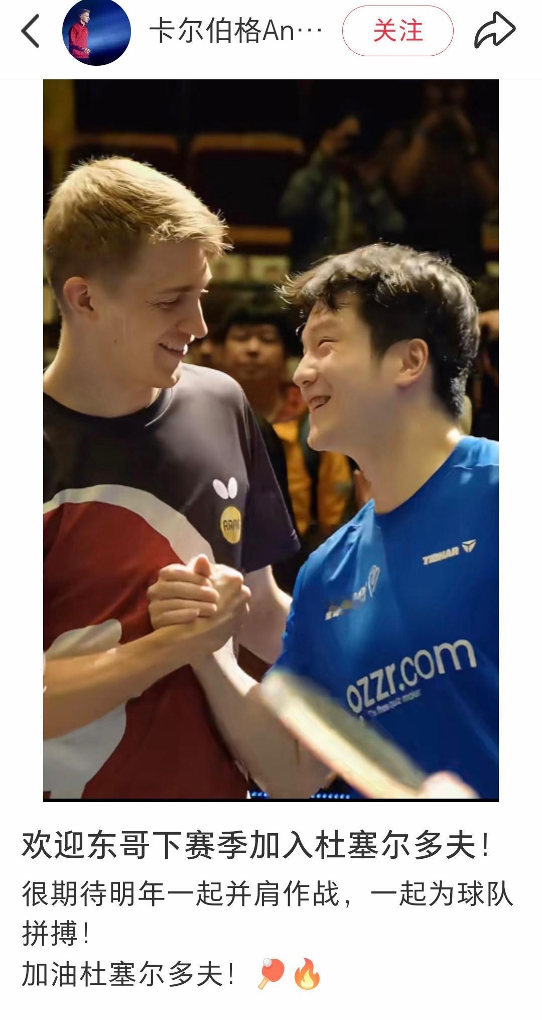 樊振东即将在德甲转会,现队友弗朗西斯卡表达感谢和祝福,而杜塞尔多夫那边的新队友邱党和卡尔伯格也发文表示欢迎,更年轻的卡尔伯格称樊振东为“东哥”,比樊振东大一岁的邱党亲切地称“东哥”,诚意满满,别忘了,杜塞尔多还有一个樊振东的亲密老友波尔,看来樊振东在新的俱乐部一顶不会感到孤单。