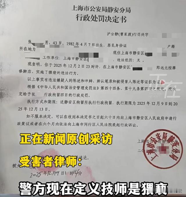 上海,一女顾客在修脚店消费时,男技师把她衣服全部脱光,还用手触摸她私密部位。女子当场报了警,男技师被拘留4天,修脚店开除了男技师,但女顾客的赔偿问题,一直没人管。修脚店称:技师签了合同,这是他个人行为,跟店里半毛钱关系都没有。 信息来源:红星新闻 赔偿的事,拖了整整3个月零14天,没人管。 刘女士,当天忙完工作,感到浑身酸痛。 2025年12月2日晚上23点17分,她走进一家修脚店。 没多犹豫,花198元买了一份按摩放松套餐,来服务的,是男技师张某。 没人问过刘女士,是否愿意接受男技师服务。 按着按着,疲惫感袭来,刘女士迷迷糊糊睡着了。 等她有意识,浑身冰凉,衣服,被张某全部脱光,一件没剩。 更让她崩溃的是,张某的手,正触碰她的私密部位,刘女士立即报了警。 民警赶到现场,调取门店监控,询问当事人,证据确凿。 张某,涉嫌猥亵,违反治安管理规定。 最终,被行政拘留4天,从12月3日执行至12月6日。 人被处理了,刘女士的委屈,才刚刚开始,她找门店要赔偿,一次,两次,三次,全被推脱。 门店负责人说,张某是个人行为,跟店里无关。 理由有两个,岗前培训过,合同也约定过,员工出事自己担责。 可没人提,张某才来门店1个月零27天,没经过完整的合规培训。 没人提,门店声称的无死角监控,恰好在刘女士按摩的房间,坏了2天。 没人提,刘女士消费时,门店未提供任何安全提示,也未告知技师服务边界。 这事,从2025年12月2日发生,一直拖到2026年3月16日。 直到采访当天,门店依旧态度冷漠,只说已经开除张某,以后不会再出事。 刘女士的损失,明明白白,一笔一笔都能算清。 心理咨询费,每次300元,共做12次,300×12=3600元。 误工费,刘女士月薪9000元,误工15天,9000÷30×15=4500元。 交通费,往返派出所、门店、法院,共286元。 可直到采访,刘女士一分钱的赔偿也没拿到。 门店说,张某已经离职,找不到人,他们不担责。 刘女士想不通,自己在店里消费,人是店里安排的。 出事了,一句个人行为,就想把所有责任推干净? 她去放松,却遭了这样的罪,这3个多月,她吃不好睡不好,反复做噩梦。 门店的冷漠,比张某的恶行,更让她寒心。 更让人不解的是,门店明明有管理漏洞,却从不反思,监控坏了不及时修,技师培训不到位就上岗。 出事后不主动道歉,不积极赔偿,只想着甩锅、敷衍。 这样的门店,还敢让消费者放心去消费吗? 门店说技师个人行为与己无关,真的能免责吗? 依据《民法典》第1191条,用人单位的工作人员因执行工作任务造成他人损害,由用人单位承担侵权责任。 张某是门店安排的技师,在服务过程中实施猥亵,属于执行工作任务,门店必须担责,合同约定员工自担责任,不能对抗消费者,这是很多门店的误区,也是大众容易被误导的点。 张某被拘留4天,就不用承担民事赔偿了吗? 依据《治安管理处罚法》第8条,违反治安管理行为对他人造成损害的,行为人还应依法承担民事责任。 拘留是行政处罚,赔偿是民事责任,两者不冲突,张某既要接受拘留处罚,也要承担部分赔偿。 门店声称无死角监控,监控坏了要担责吗? 依据《民法典》第1198条,经营场所经营者未尽到安全保障义务,造成他人损害,应承担侵权责任。 门店监控损坏未及时维修,无法防范侵害发生,也无法固定证据,属于未尽安全保障义务,需加重承担赔偿责任,这也是大众想不到的,以为监控坏了只是意外,实则要担法律责任。 门店一句甩锅,就能逃避法律责任吗?您对这件事有什么看法呢?