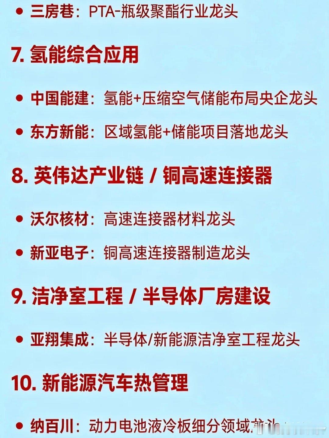 十大热点科技及其产业链核心龙头在新质生产力加速推进与全球产业升级的双重驱动下,科技赛道成为资本市场核心主线。以下聚焦十大具备高成长潜力的热点科技领域,深度拆解产业链逻辑与核心龙头标的,为布局提供参考:一、存储芯片:国产替代+涨价周期共振存储芯片作为数字经济核心硬件基石,受益于AI服务器需求爆发与全球产能收缩,行业景气度持续上行。2026年一季度全球DRAM内存合约价环比上涨80%-95%,NAND闪存价格环比上涨33%-60%,手机用存储芯片现货价格累计涨幅超300%,供需缺口推动涨价周期延续。兆易创新:国产NOR Flash与MCU龙头,在消费电子、工业控制等领域市占率稳居国内前列,同时布局DRAM业务,深度受益于国产替代与产品涨价双重红利。太极实业:半导体封测与存储代工核心企业,依托子公司海太半导体切入存储芯片封装测试环节,客户覆盖全球主流存储厂商,业务与行业景气度高度绑定。盈新发展:跨界布局存储芯片的转型代表,通过技术引进与产能建设突破存储核心环节,在细分赛道形成差异化竞争优势,成长弹性显著。二、AI算力/算电协同:AI基建核心支撑随着AI大模型训练与应用落地加速,算力需求呈指数级增长,而算电协同成为解决AI数据中心能耗问题的关键,绿色能源基建与算力设施融合趋势明确。中国电建:算电协同+绿色能源基建龙头,既参与AI数据中心建设,又布局光伏、风电等绿色电源项目,形成“算力设施+能源供给”一体化服务能力。中国能建:新型电力系统与算电融合央企龙头,在特高压输电、储能等领域具备技术与资源优势,为算力中心提供稳定、高效的电力保障,同时布局氢能等新兴能源。三、电网设备/电力设备出海:政策红利+全球扩张国内“十五五”期间电网投资规模达4万亿元,年均投入超8000亿元,特高压、智能电网成为投资重点;同时全球电网投资增速超10%,国内龙头企业凭借技术优势加速出海。顺钠股份:输配电设备+AI算力基建共振龙头,产品覆盖变压器、开关柜等核心设备,既受益于国内电网升级,又切入AI数据中心供电环节,双重逻辑驱动增长。鼎信通讯:智能电网通信设备龙头,在电力线载波通信领域技术领先,产品广泛应用于配网自动化、用电信息采集等场景,市占率稳居行业前列。四、跨境支付(CIPS):人民币国际化助力人民币跨境支付系统(CIPS)作为人民币“走出去”的核心基础设施,已覆盖全球189个国家和地区,2025年处理金额预计达175万亿元,同比增长约43%,跨境支付场景持续扩容。中油资本:能源金融+跨境支付平台参股龙头,依托中石油产业链资源,深度参与能源贸易跨境支付业务,同时参股相关支付平台,充分受益于人民币国际化进程。五、海上风电:新能源赛道重要增长极在“双碳”目标指引下,海上风电凭借资源丰富、发电效率高的优势,成为新能源装机的核心方向之一,大型化、深远海化趋势明显。金风科技:风电整机制造龙头,在海上风电领域技术积累深厚,产品覆盖2.5MW-16MW全系列机型,是国内海上风电项目的核心供应商,重点受益于海风装机放量。锡华科技:风电大型铸件核心厂商,专注于风电轮毂、底座等关键铸件产品,为全球主流整机厂商提供配套,在大型化铸件领域具备技术与产能优势。六、化工周期(甲醇/尿素):供需紧张驱动涨价中东地缘冲突导致全球化工原料供给受限,叠加国内行业供需格局改善,甲醇、尿素等产品价格持续上行,顺周期逻辑凸显。赤天化:贵州区域甲醇与尿素双主业龙头,依托区域资源优势降低生产成本,产品直接受益于全球化肥供给紧张与价格上涨,业绩弹性显著。三房巷:PTA-瓶级聚酯行业龙头,完整布局“PTA-聚酯-瓶片”产业链,受益于聚酯瓶片期货价格上涨与下游包装、纺织需求复苏,盈利水平持续改善。七、氢能综合应用:未来能源重要方向氢能作为清洁、高效的二次能源,在交通、工业、储能等领域应用场景持续拓展,国内政策密集支持氢能产业链建设,项目落地速度加快。中国能建:氢能+压缩空气储能布局央企龙头,在氢能制储输用全产业链均有布局,同时推进压缩空气储能项目落地,构建多能互补的能源体系。东方新能:区域氢能+储能项目落地龙头,聚焦氢能示范应用与储能项目建设,在地方氢能产业链中占据核心地位,受益于区域政策扶持与项目放量。八、英伟达产业链/铜高速连接器:AI硬件核心环节英伟达作为AI算力核心供应商,其产业链上下游需求持续爆发,铜高速连接器作为数据传输关键部件,在AI服务器、高端设备中不可或缺。沃尔核材:高速连接器材料龙头,专注于连接器用绝缘材料、导电材料等核心部件,产品性能满足高端设备传输需求,深度绑定英伟达产业链核心企业。新亚电子:铜高速连接器制造龙头,在消费电子、工业控制、AI设备等领域连接器产品市占率较高,技术实力与产能规模行业领先,充分受益于产业链需求增长。九、洁净室工程/半导体厂房建设:半导体基建刚需半导体产业扩产与新能源项目落地带动洁净室工程需求,洁净室作为高精度生产的核心基础设施,市场规模随产业升级持续扩大。亚翔集成:半导体/新能源洁净室工程龙头,具备半导体厂房、新能源电池车间等洁净室设计与施工一体化能力,客户覆盖国内外主流半导体、新能源企业,订单饱满。十、新能源汽车热管理:电动化升级核心赛道新能源汽车渗透率持续提升,热管理系统从“配件”升级为“