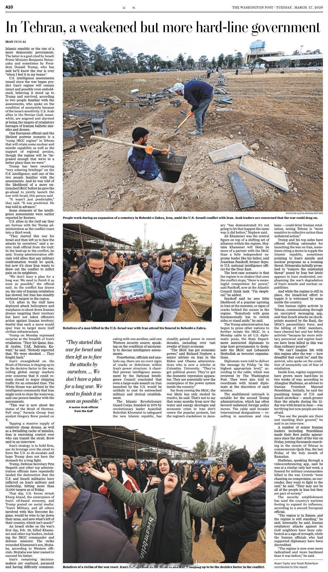 《华盛顿邮报》报道,美国情报界估计,伊朗政权目前整体保持完整,虽然被削弱但是对美态度更强硬。但与此同时,美国的海湾地区盟友开始对特朗普感到愤怒,美国为了以色列发动战争,但是海湾地区国家却要承担相应后果