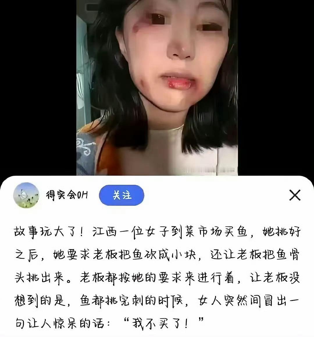 江西买鱼的事处理完了, 女顾客赔了加工费, 摊主赔了医药费, 俩人握手言和。 可网友评论区一边倒:这顿打,挨得真不冤! 说实话我也不同情。你让人家摊主杀鱼、刮鳞、切块、剔骨,一套精细活全干完,你轻飘飘一句"不要了"转身就走?这哪是买东西,这是拿老实人的辛苦开涮啊。 摊主凌晨两三点去进货,站一天就挣个辛苦钱。鱼都给你处理好了,鳞也刮了,骨也剔了,这鱼卖给谁去?放两个小时就不新鲜了,等于白干还赔本。换谁谁不急眼? 我发现现在有些人真把"顾客是上帝"当尚方宝剑了。上帝也得讲道理啊!你去饭店点个菜,厨师做完了你说不要了,你看人家揍不揍你? 打人肯定不对,摊主赔医药费没毛病。但这事根源在哪?在女顾客那副"我消费我有理"的嘴脸。底层人靠手艺吃饭,每一分钱都是汗水换的,你糟践别人劳动,就是在点炮仗。 尊重是相互的。别欺负老实人,真把人家逼急了,你那点钱保不住面子,人家那双手可保不住脾气。 你们说说,要是你辛辛苦苦忙活半天,对方一句"不要了",你能忍住不动手吗?