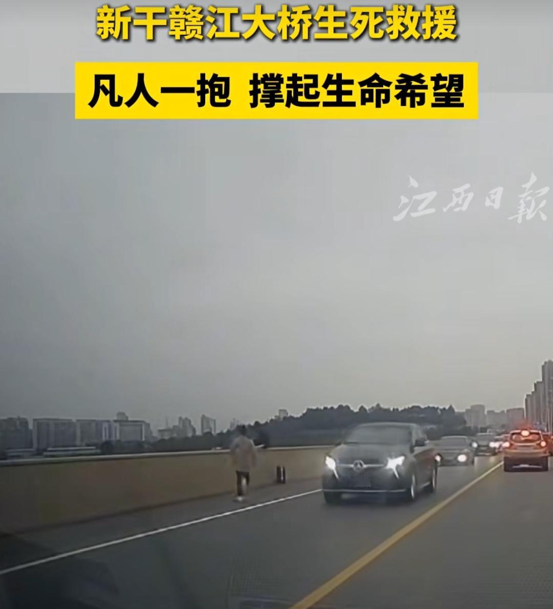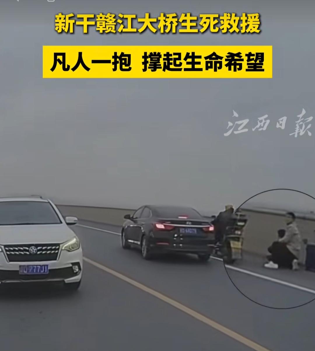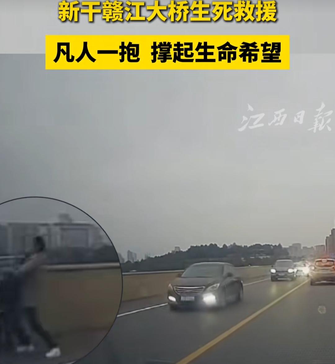 2月24日的新干赣江大桥,车流穿梭间,一场生死救援悄然上演。 一名年轻男子翻越护栏,半个身子悬在桥外,江风裹挟着绝望,将他推向危险边缘。驾车途经的刘薇最先瞥见这惊心动魄的一幕,心头一紧,立刻提醒身旁的丈夫周子怿。没有丝毫犹豫,没有半分退缩,周子怿当即让妻子靠边停车,推开车门,在疾驰的车流中逆行飞奔,冲向桥边。 就在男子即将坠桥的刹那,他奋不顾身扑上前,用尽全力将对方紧紧抱住。那是一个用生命托举生命的拥抱,手臂青筋暴起,脚下稳稳扎根,拼尽全力将摇摇欲坠的年轻生命从悬崖边拉回安全地带。这一抱,稳住了濒于崩溃的灵魂;这一冲,扛起了素不相识的责任,让冰冷的桥面瞬间涌动着滚烫的善意。 随后,热心路人主动报警,周子怿夫妇与赶来的市民一同守在男子身边,轻声安抚,直到民警和救援人员抵达。他们没有留下姓名,没有索要感谢,只是在确认男子安全后,默默离开,重新汇入茫茫车流。 有人说,绝望往往是一念之间的事,而温暖,恰恰也是。我们总在追问“英雄何在”,却不知英雄从来都藏在凡人的选择里,是看见危险时的挺身而出,是面对陌生生命时的本能守护。这一抱,抱回的不仅是一条生命,更是我们对这个世界最朴素的信任:总有人愿意为你停下脚步,总有人愿意在你坠落前,伸出双手。 这世间没有超级英雄,只有无数个像周子怿一样的普通人,在关键时刻选择了善良与勇敢。正是这些凡人善举,拼凑成了我们生活里最温暖的光,让我们相信:再冷的寒冬,也会被善意融化;再难的时刻,总有人愿意拉你一把。善良与勇敢