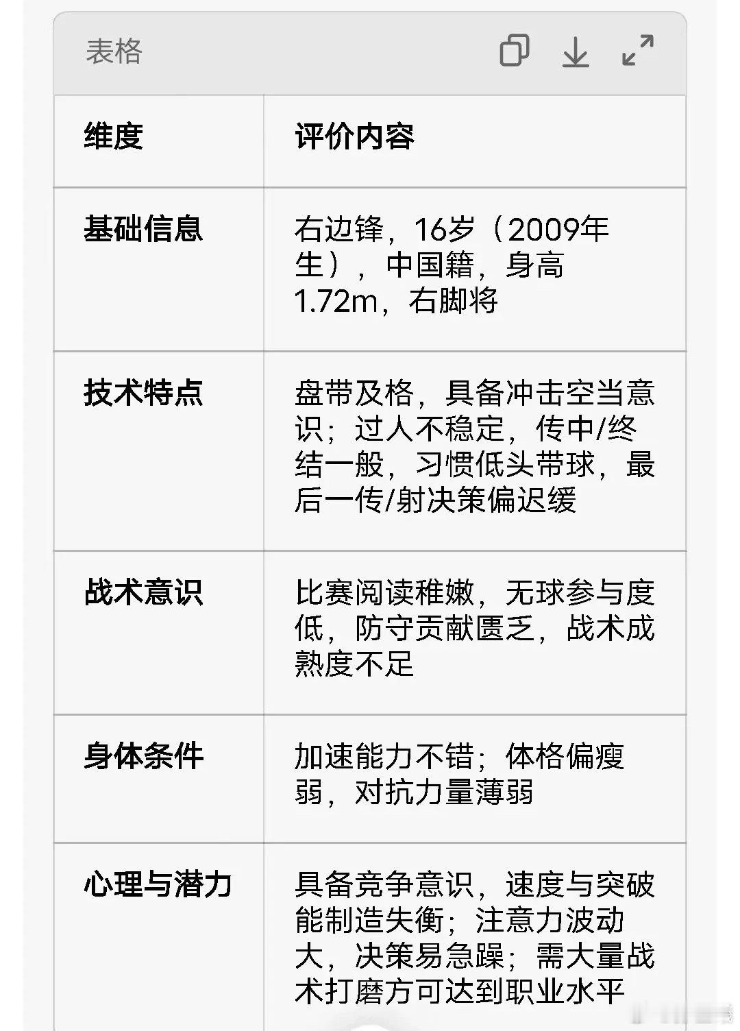 其实中国球员别说在16岁,大部分年龄及大部分球员都可以套用这套报告.从小开大脚的,为了赢的大环境下,我们基本没有战术体系,大部分教练也不会教,看过最多的就是二过一、第三人转移以及背套下底传中,再就是定位球.足球整体的理解,我们肯定是匮乏的.