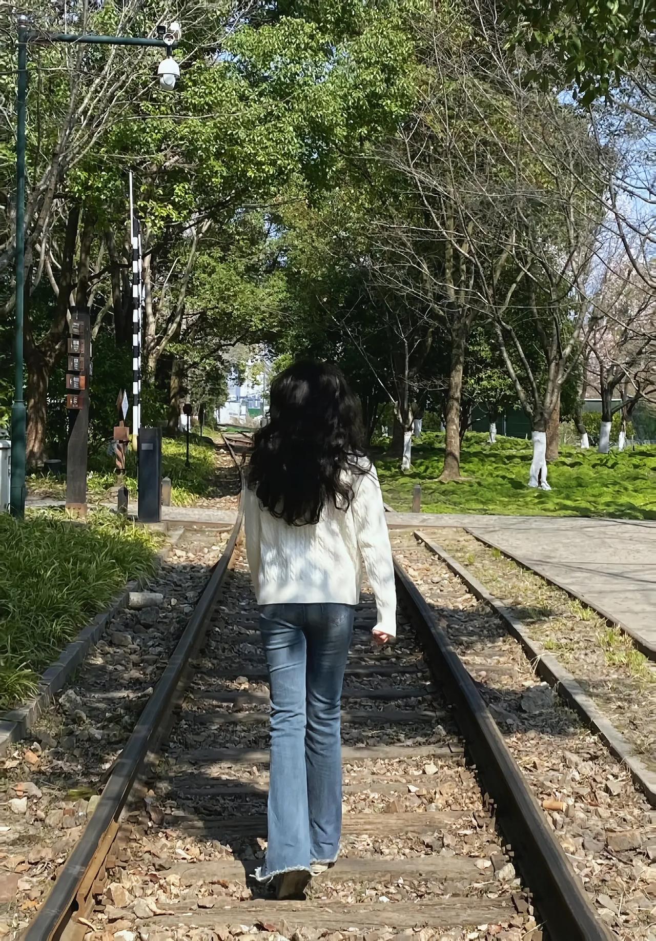 阳光明媚,女孩坐在铁轨旁。