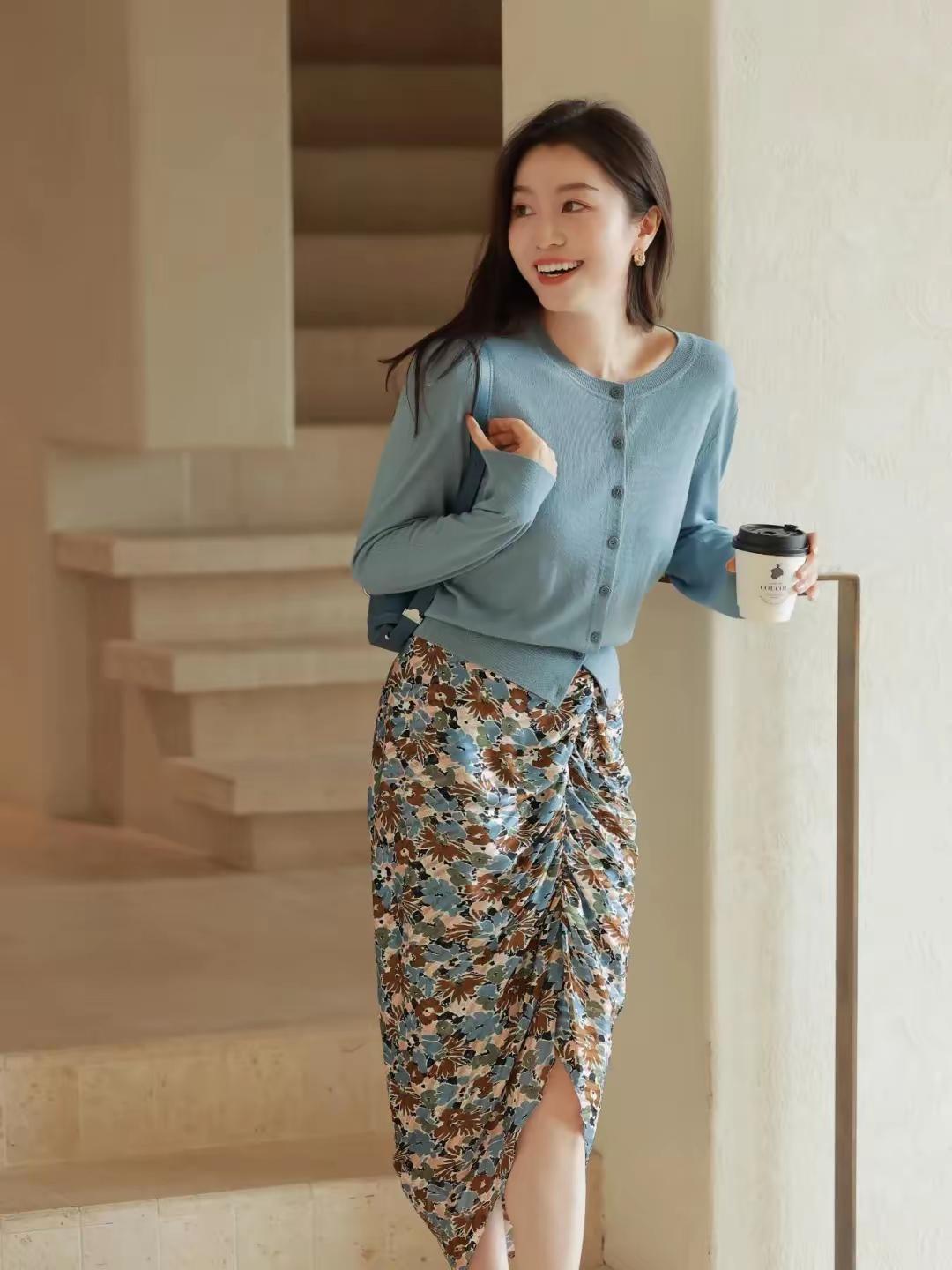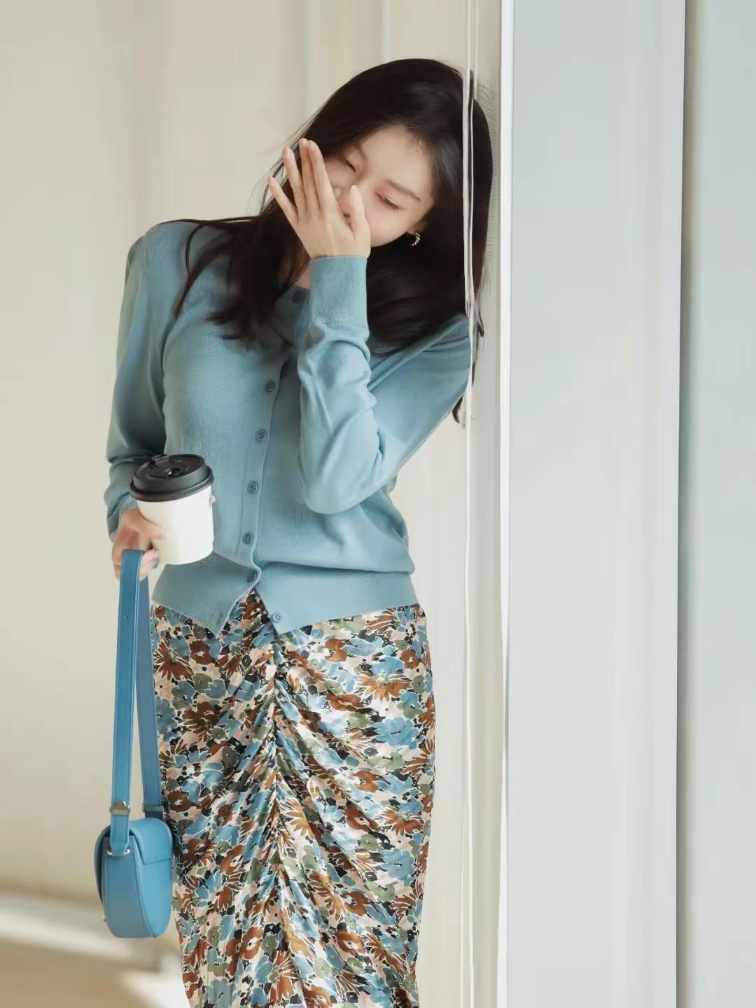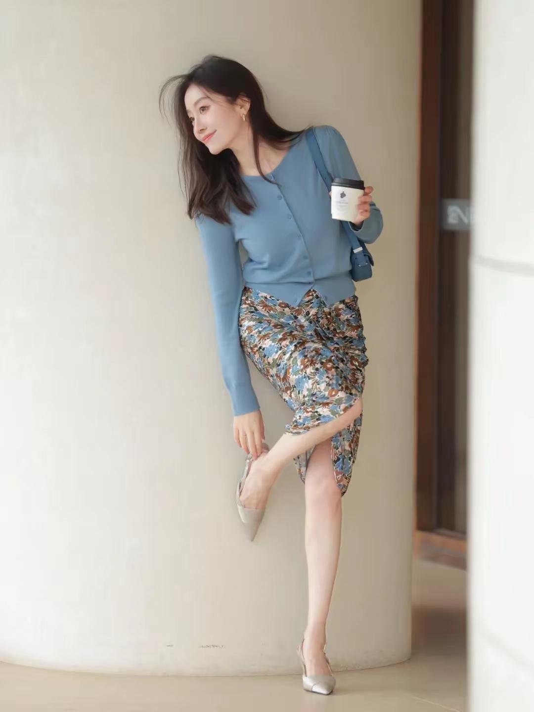 🌿 场景穿搭解析:温柔知性风碎花裙穿搭 这套穿搭非常适合通勤上班、咖啡馆探店、文艺约会等场景,是温柔又显气质的轻熟风组合: ✨ 核心单品 • 上衣:雾霾蓝圆领短款针织开衫 ◦ 软糯针织材质,亲肤透气,雾霾蓝色调温柔显白,自带清冷感。 ◦ 短款不规则下摆设计,拉高腰线,优化身材比例,单穿或内搭都很合适。 • 下装:复古碎花抽褶开叉半身裙 ◦ 碎花图案以蓝、棕、米白为主色调,与上衣颜色呼应,复古又和谐。 ◦ 抽褶+开叉设计,增加灵动细节感,同时修饰胯部线条,走路时若隐若现,增添女人味。 • 配饰: ◦ 雾霾蓝马鞍包:与上衣同色系,提升整体搭配的协调感,小巧精致,适合日常通勤。 ◦ 金色小耳环:简约小巧,点缀细节,增添精致感,不会过于张扬。 • 鞋履:银色尖头细跟凉鞋 ◦ 尖头设计延伸腿部线条,银色鞋面低调又高级,细跟款式优雅显气质,适配裙装。 🌟 风格亮点 • 温柔知性:雾霾蓝+复古碎花的组合,色调柔和,气质温婉,很适合轻职场和日常约会。 • 显高显瘦:短款开衫+高腰半身裙,是打造“三七分”身材的经典公式,轻松穿出大长腿。 • 细节精致:抽褶开叉、同色系包包等小细节,让基础款穿搭更有层次和质感。 💡 搭配延伸 • 想更通勤:外搭一件浅灰色西装外套,搭配乐福鞋,干练又温柔。 • 想更休闲:换一双白色帆布鞋,搭配棒球帽,秒变法式休闲风。 • 想更保暖:叠穿一件白色高领打底,或外搭一件米色风衣,应对微凉天气。 📸 场景适配 • 通勤上班:得体又不失时尚感,适合轻职场环境。 • 咖啡馆探店:与文艺清新的场景氛围高度契合,拍照出片率极高。 • 文艺约会:温柔知性的气质,很容易给人留下好印象。 碎花裙 文艺风