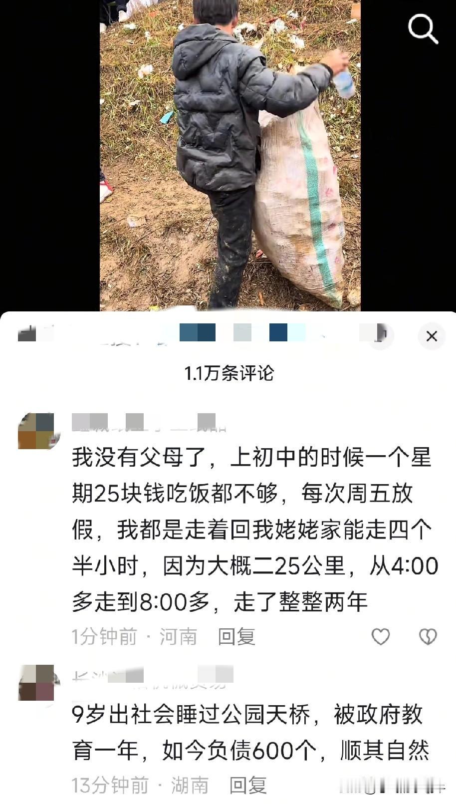 没穷过的人怎么能体会穷苦人的内心?小男孩自食其力,吃苦耐劳,长大一定会有出息的!至少他比同龄人更懂这个世界的残酷,他会更努力的活着,内心会更坚强!有困难更会迎难而上!加油小孩[赞] 看着他也会想起我,跟我爸去收废品换碗的时候,我也去捡废品,我也被人当做猴一样看,那时候才上初中好像,脸面是个啥?不存在的,为了钱为了生活,再苦再累我也忍了!忍不了的是别人拿我打趣还有被盯着看!!! 记得有一次,我们在一个村子里等人家出来买碗,旁边陆陆续续来了几个大人,还有一个男孩子,有几个人挺好的,还说好话跟我爸聊天还以为不让我读书了,问东问西,有几个就没那么好心,一直说让我爸把我嫁他们村,他们能给我找几个好人家,让我随便挑,把我气的,我又不能发脾气!我就忍着忍着,说的我真的很想哭 那时候只要谁一提到让我嫁人,我就想发疯,对结婚这个词非常反感厌恶!还有那个男孩子,在我们车子跟前守了一天,他试图跟我说话,我一句话都没理!!那男的也真是个人才,在他家里找了点杂七杂八的东西出来硬是换了两个碗!我心想,年纪轻轻,不去上学也不去打工挣钱不去地里干活,窝家里当饭桶啊?内心鄙视好吃懒做的人!还一直色眯眯盯着我!真是反感至极!!! 从不怕别人笑话我们干的活又累又脏,我们用自己双手挣来的干净钱,他们爱用什么眼神就用什么眼神,但是最受不了的就是每到一个地方总有人说要把我嫁他们那,所以我很排斥跟着去,但是每次都被我妈的威胁与恐吓吓着硬着头皮去!心里那个委屈与无助!无人理解无人诉说!一抱怨,他们总会说,是你在花我们的钱读书,你花的最多,我就不反抗了[流泪] 他们总喜欢站在道德的至高点上对我打击又教育,搞得我一直觉得我就不该出生在他们家,我就不该活着,如果没有我,我家就不会穷……! 想想小时候怎么长大的?这换做内心脆弱的其他人,可能早就自杀了!我是经常在接受外人的怂恿家人对我苛责,家人嫌弃我与贫穷与自身体质差四种内心折磨的人,所以自卑,顾影自怜,不敢反抗不敢抱怨,还要事事做最好,唯一能开导我安慰我的就是读大道理,安慰自己,美句子都写了两个厚厚的日记本!!! 现在想想,还好喜欢文字,是它与我的爷爷奶奶拯救了我!!所以多读书不仅使人脑子变清醒还会鼓励安慰人变得更坚强…