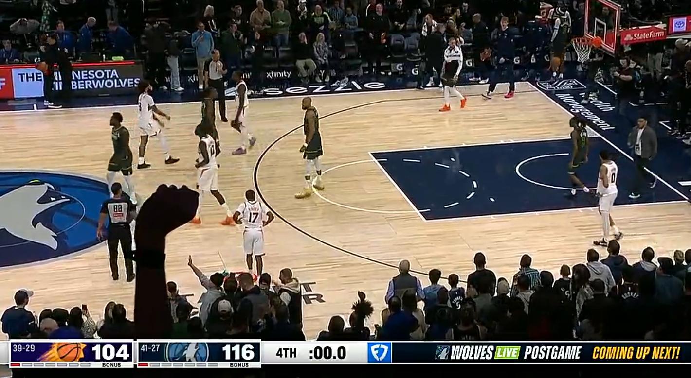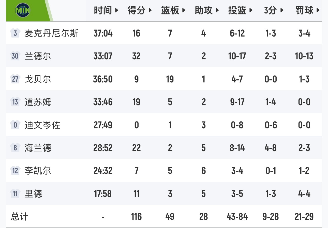 杰伦格林17中3只得9分,爱德华兹伤缺,兰德尔32分,海兰德22分,森林狼116-104太阳,暂时升到西部第五,太阳仍居第七。