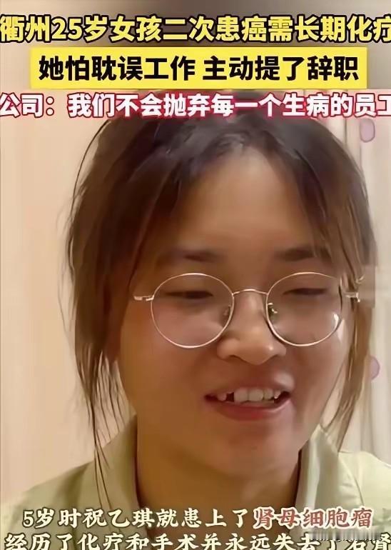 2024年,浙江25岁女孩患癌,跟公司提出辞职,公司领导却拒绝她的要求,谁料,公司接下来的做法让女孩泪流满面!2024年,在浙江衢州一间极普通的办公室内,发生了一场至今让人脊背发热的“对峙”25岁的女孩祝乙琪, 手里攥着皱巴巴的辞职信,指尖都在发抖。这不是她第一次跟癌症打交道,5岁那年她就得了肾母细胞瘤,硬生生扛过化疗捡回一条命,本以为苦尽甘来,2024年5月的一场剧烈腹痛,又把她拽回深渊——直肠癌晚期,癌细胞已经转移,连手术的机会都没有。 拿到诊断书的那天,她在医院走廊哭了半小时,擦干眼泪做的第一件事,就是回公司写辞职信。她太懂事了,知道自己后续要频繁化疗、住院,肯定会耽误工作、占用岗位,不想成为公司的“累赘”,信里字字恳切:“后续治疗需长期请假,自愿离职,不给公司添负担” 。 她低着头把信递过去,心里早就做好了准备——职场上见多了“人走茶凉”,多少公司遇到患病员工,巴不得赶紧甩包袱,停社保、扣工资、逼辞职,她见得太多了。可领导接过信,看完后沉默了几秒,突然拍了桌子,语气又硬又暖:“想辞职?我不准!” 祝乙琪当场就懵了,她以为自己听错了,直到领导又补了一句:“身体才是第一位,安心治病,公司不会抛弃任何一个认真干活的员工,你的岗位,永远给你留着!” 这话不是场面话,是实打实的行动。第二天人事就找了过来,直接改了考勤规则:不用天天打卡,每月来20天就行,化疗假随时批,工资一分不少,五险一金照缴。领导特意叮嘱:“不是可怜你,是怕你断了医保,一场化疗自费要三万,医保能报七成,这事儿比考勤重要一万倍!” 更暖心的还在后面。领导带头,同事们悄悄凑了十万块现金,没搞募捐、没开大会,就默默把信封塞到她手里;她化疗回来,工位永远干干净净,积压的工作早就被同事们分担完,电脑里还标着清晰的工作备注;她化疗后手指发麻,同事们主动帮她递文件、敲键盘,连热水都提前给她倒好。 祝乙琪说,自己这辈子最幸运的,不是遇到多少贵人,而是遇到了一群把她当家人的同事和领导。她化疗时疼得睡不着,就抱着同事送的小毯子;吃不下饭,同事们就变着花样给她带清淡的饭菜;她情绪低落,大家就陪着她聊天,给她打气 。 这事儿放到现在的职场,简直是“异类”。多少公司把员工当工具人,有用时捧上天,没用时一脚踢开,患病辞职、裁员劝退成了常态,人性和温情早被利益磨得一干二净。可这家衢州的小公司,偏偏反其道而行,用最朴素的善意,给了一个25岁女孩对抗病魔的底气。 祝乙琪没有被打垮,她笑着说:“别人对我这么好,我为什么要苦着脸?”她一边化疗,一边坚持上班,把陌生人的善意、公司的温暖都记在小本子上,当成对抗癌症的力量 。 这不是什么惊天动地的大事,却比任何豪言壮语都动人。它戳破了职场冷漠的假象,告诉我们:公司的格局,从来不是赚多少钱、做多大规模,而是在员工最难的时候,愿意伸手拉一把;人性的温暖,从来不是嘴上的关心,而是实打实的守护与担当。 祝乙琪的故事,暖的不只是她一个人,更是无数打工人的心。它让我们相信,职场里不只有利益算计,还有真情与善意,还有不抛弃、不放弃的人间温度。 各位读者你们怎么看?欢迎在评论区讨论。