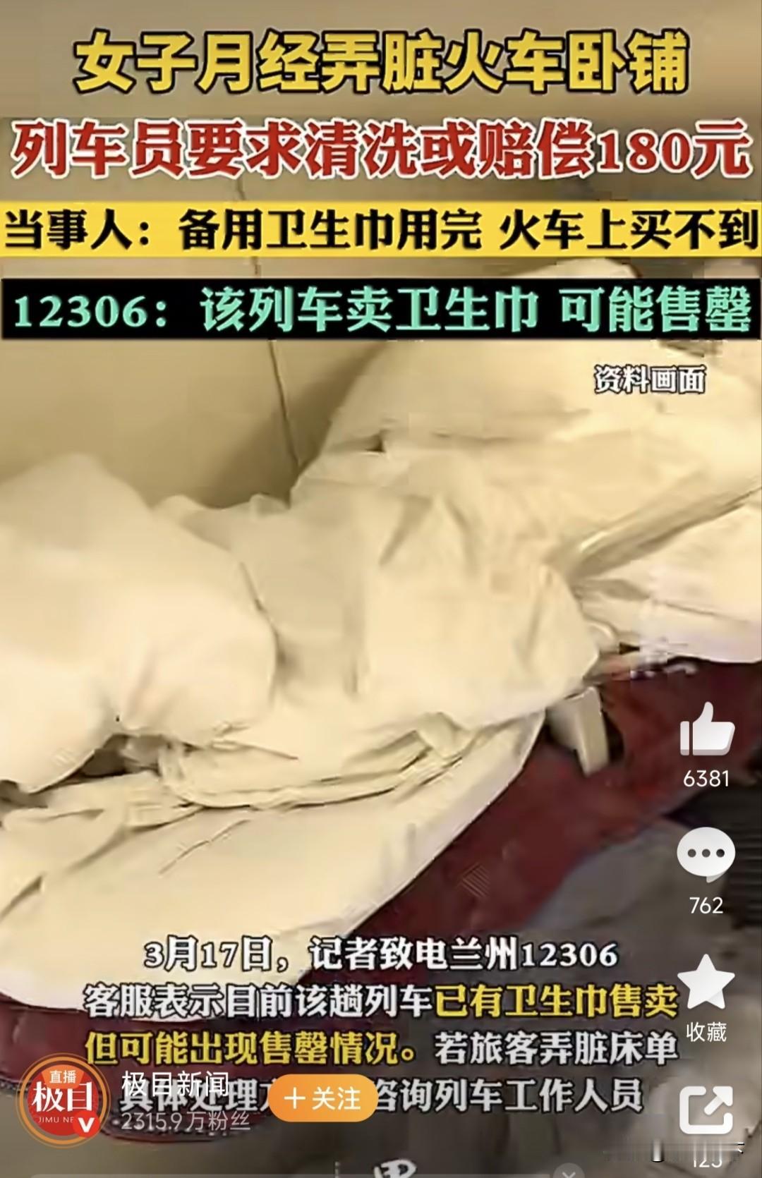 为什么火车上买不到卫生巾这种必需品[嘘]?为什么不卖女性用品,一点也不懂做生意的思路! 女人真的太难了,而且说实话这种床单也就十几块,居然要人家赔180,有点欺人太甚了。 本来就尴尬难堪,也不换位思考体谅下,下次直接找乘务员要,没有的话就打预防针,可能要弄脏床单了,不可能大晚上一直站着吧! 能买到啤酒却买不到卫生巾,冷知识:啤酒不是必需品,卫生巾是。 最开始的争议难道不是采买的一个小床单就要180吗,是正常招标价格吗,怎么上新闻绝口不提这件事了? 2026了 因为要不要卖卫生巾上午新闻,好可悲啊,那不就是一件日用商品嘛,为什么不卖?