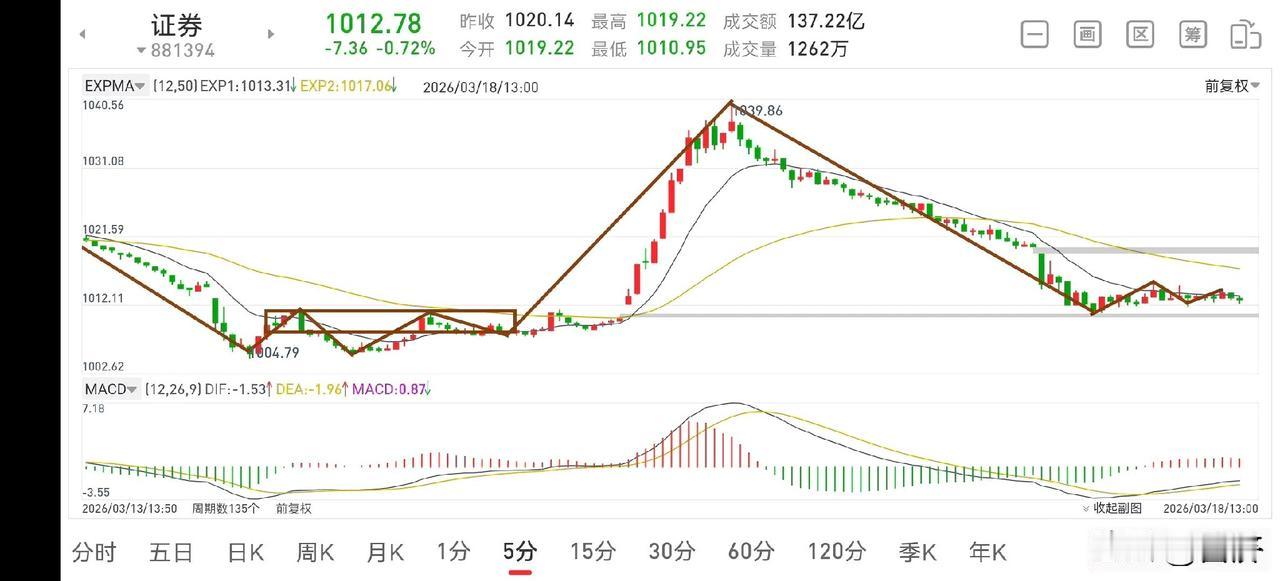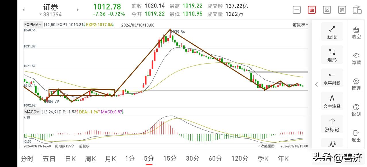 聊聊证券板块(2026.3.18) 证券板块从这二天的走势来看,昨天的冲高回落是阶段性的出货,再之前的横盘震荡是主力吸筹,所以此处主力是做了一个低吸高抛的动作,那么接下来再次破新低已成定局。此处只要耐心等待大阴线出来即可考虑回补仓位。 1.从30分钟图一上看,昨天下午和今天上午的下挫都比较强,属于超跌,那么下午就可以看反弹30分钟向上一笔,那么可以考虑操作吗?首先我是不高兴的,继续持5成仓位观察,当然有兴趣的可以考虑操作一下,大概反弹至2028点附近,也就是中枢上沿附近,到时再把仓位退出来,因为总体还是向下的。 2.从5分钟图二上看,目前正在构建一个5分钟中枢,如果下午放量突破中枢上沿,有兴趣的就可以考虑做T,但务必要谨慎哦!没把握的就老实等大阴线出来后再考虑操作,到时我也会做出友情提醒。 3.商业航天妖龙已经反转,但上涨不是一蹴而就的,耐心持股待涨即可,此处从周线上看,大概率会再走二笔反抽,从而在周线上出现底部抬高,顶部抬高的上涨走势,耐心等待主升到来即可。 总之,各大主流板块都已进入尾声阶段,证券板块还差最后一跌,黎明即将到来,后期走势值得期待。