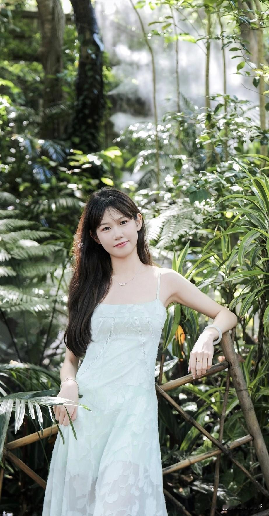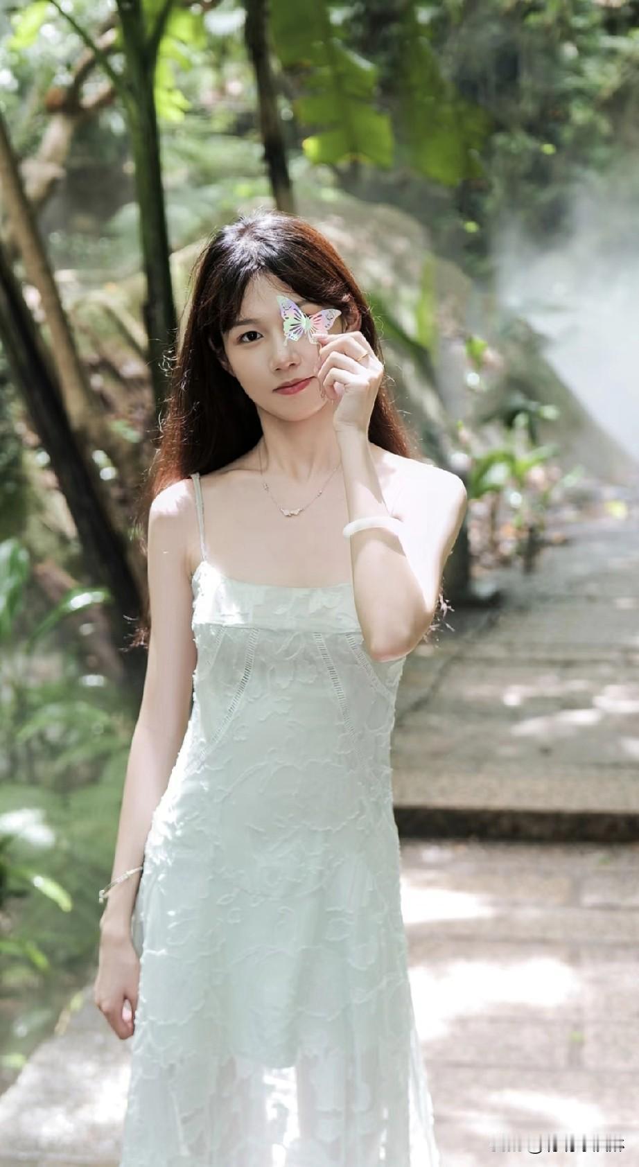 夏日清新穿搭,白色针织裙搭配自然绿意,温柔迷人。