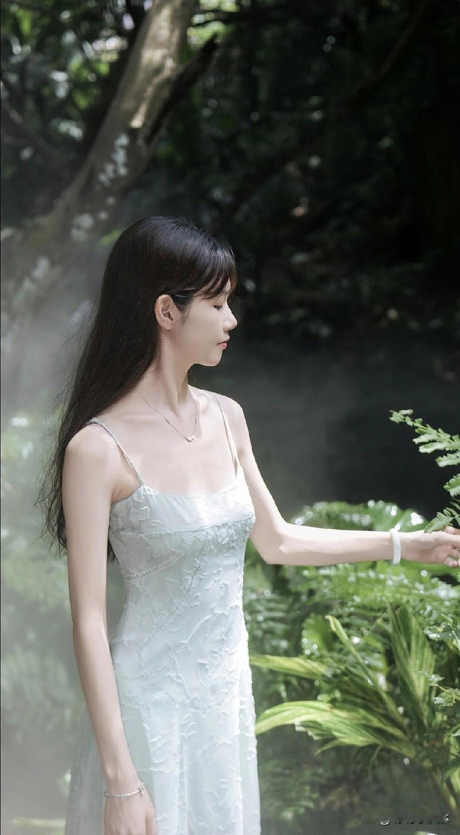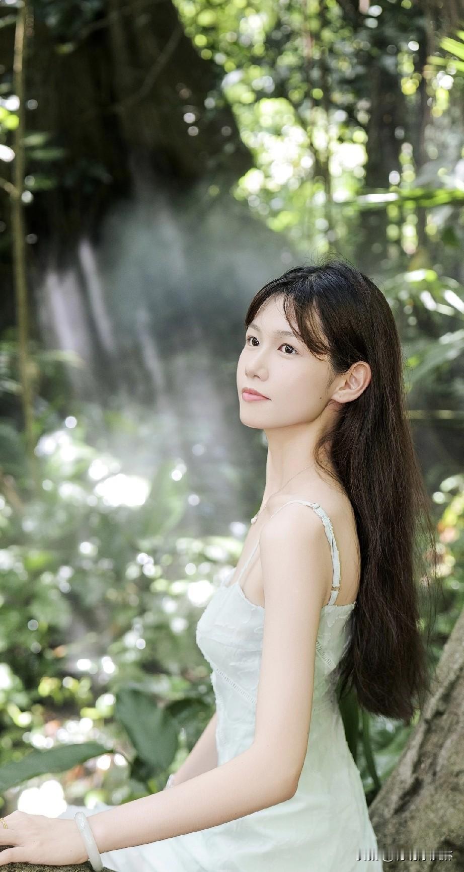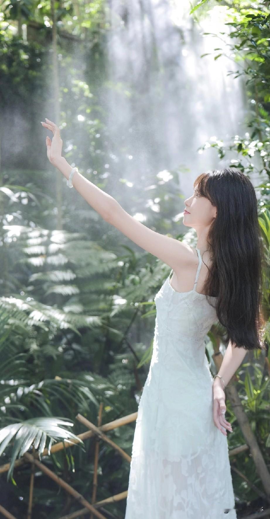 夏日森林中的清新少女,白色连衣裙与绿意盎然的背景相映成趣。