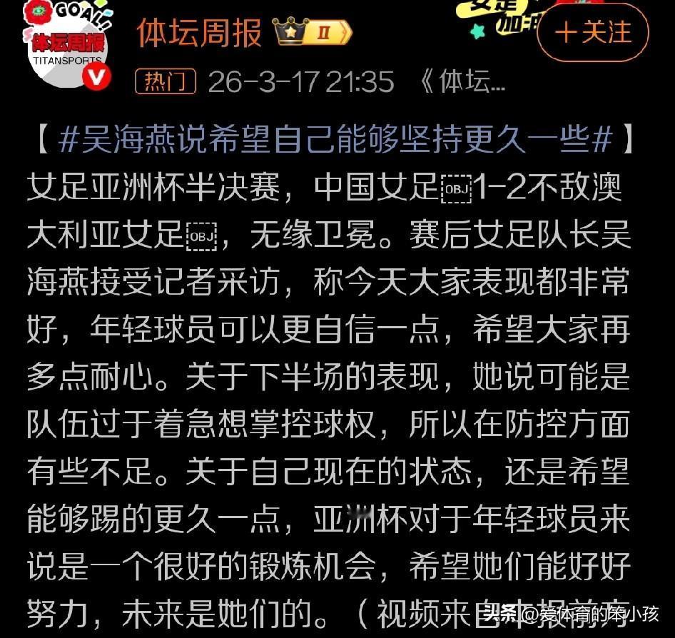想想上个月,国际足联的官网,还在对中国女足老队长吴海燕的33岁生日表达祝贺。而她的那种成熟、内敛还有担当,包括脸上流露出的沉稳又不失自信的笑容,也总是给我们留下深刻印象,甚至深深感染着我们。 在女足亚洲杯的赛场上,当面临主场作战的澳大利亚女足的挑战时,吴海燕和队友们尽管已经发挥出了不错的水平,整体状态也不算太差,也确实拼出了一些机会。更在上半场一度依靠张琳艳自己制造出的点球命中,和澳大利亚女足战成1:1平。 但就像吴海燕在赛后接受采访时所说的那样,中国女足在下半场还是有点用力过猛,想要掌控比赛局面,反而导致自身在防守端承受了更多的压力,给了对方打出一些漂亮进攻并完成关键一次射门,从而实现2:1胜出的机会。 这场女足亚洲杯的半决赛整个下半场中国女足也确实在被天时地利人和的澳大利亚女足压着打。体能方面的劣势还有攻防两端的统筹做的不够合理,包括过于想争取机会进球,还有换人效果不够明显,也让中国女足踢得有些着急,失去了最后扳平比分的机会。替补守门员彭诗梦的出击不当也让中国女足提前失去了最终获胜,从而争取卫冕的机会。 比赛结束之后,吴海燕带着眼泪笑着面对球迷,并向他们举手致意的场景让很多球迷跟着一起动容。这样的一个吴海燕,对这片绿茵场的确还充满了依恋和热爱,就像她在接受采访时讲到的一点,就是很希望在这样的绿茵场上可以站的久一点,更久一点。 33岁的她,尽管有一次拦截方面的失误,还出现了部分时段盯人不紧的情况——但是对于吴海燕个人来说,她已经做到了倾其所有。并在比赛当中展现出来了自己的综合实力。曾经因伤遗憾错过中国女足关键比赛的那些遗憾,也许在未来的赛场上都未必还有真正得到弥补的机会。但是在每一次机会到来时,都敢于在中国女足国家队需要自己的时候站出来,去承担自己的那份责任,接受各种挑战,也承受各种批评以及质疑的声音,这就是吴海燕她们这些中国女足老将们的一种坚守吧。 让我们在这里把鼓励的掌声送给中国女足的老队员们,也送给像吴海燕这种默默付出不求索取和回报的铿锵玫瑰。愿他们在人生的每一个位置上,都可以绚烂绽放。他们场上的飒爽英姿,还有场边的笑中带泪,真的都很美。不是吗?