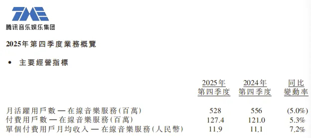在计划调整的披露内容,腾讯音乐称,该公司上市时采用付费订阅用户数及单个付费用户月均收入作为在线音乐服务的关键经营指标;然而,近年来公司业务模式已发生显著变化。随着广告及其他与IP相关业务的持续扩大,以及公司为在线音乐订阅提供多层级会员服务,每位付费会员对整体业务的贡献存在差异。因此,公司愈加聚焦以收入和利润作为核心绩效指标。鉴于这一发展,自下季度起,将停止披露若干季度经营指标,包括在线音乐月活跃用户数、付费用户数及单个付费用户月均收入,改为每年披露一次年末音乐服务付费用户总数。