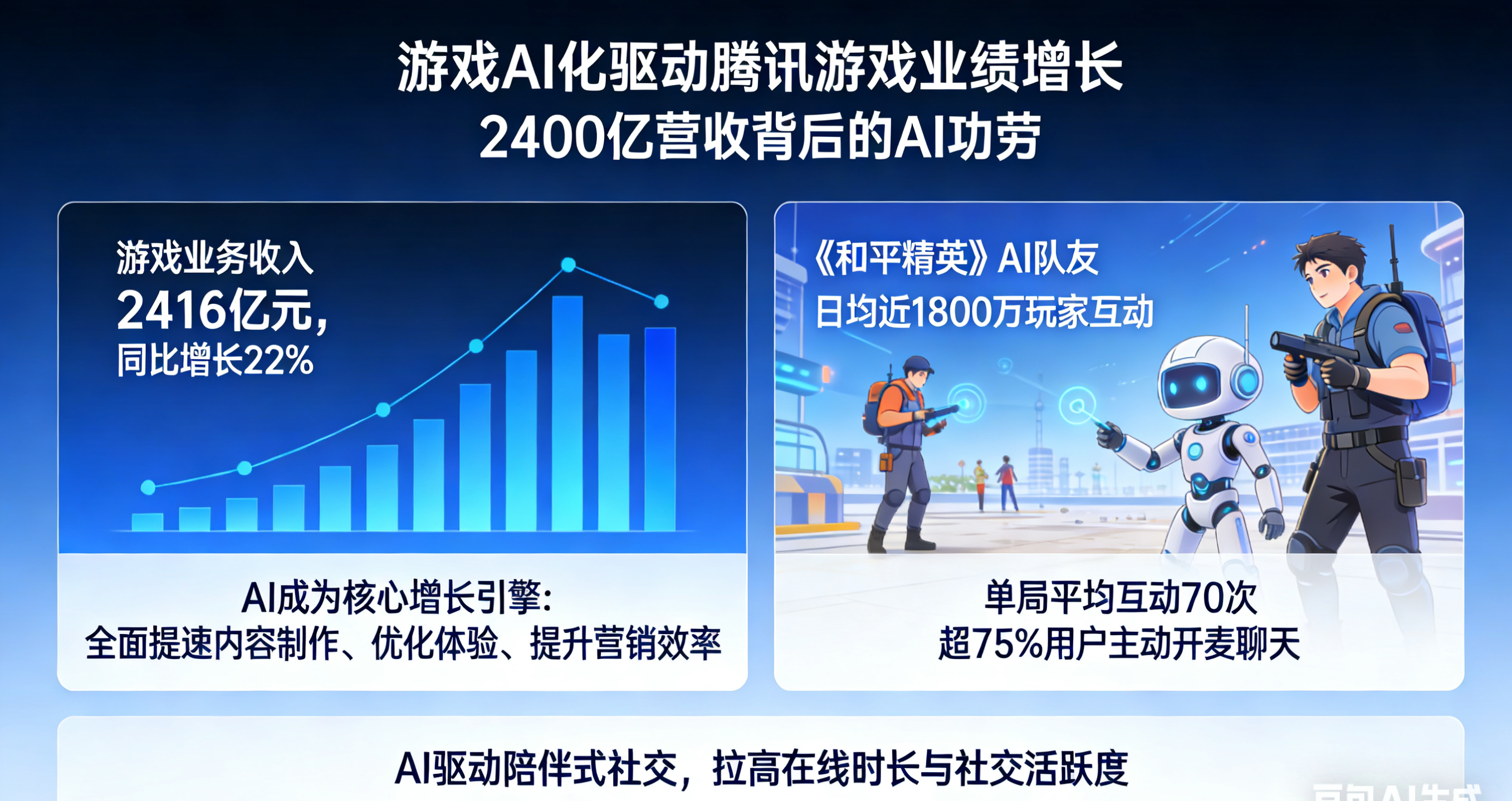秦岭笑谈 【游戏AI化驱动腾讯游戏业绩增长,2400亿营收背后有AI功劳!】腾讯2025年财报出炉,游戏业务收入2416亿元,同比增长22%。财报明确指出:AI全面提速内容制作、优化体验、提升营销效率,成为核心增长引擎。游戏AI队友情绪价值拉满《和平精英》AI队友爆火出圈,情绪价值拉满:日均近1800万玩家互动,单局平均互动70次,超75%用户主动开麦聊天,直接拉高在线时长与社交活跃度,用AI把游戏玩成“陪伴式社交”。和平精英AI队友 游戏AI