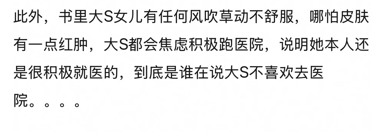 此外,书里大S女儿有任何风吹草动不舒服,哪怕皮肤有一点红肿,大S都会焦虑积极跑医院,说明她本人还是很积极就医的,到底是谁在说大S不喜欢去医院。