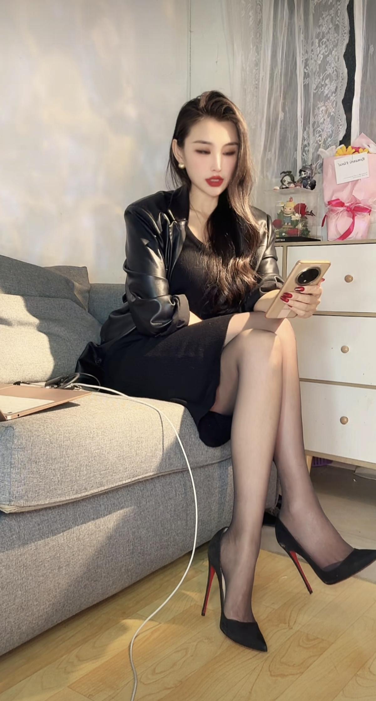 黑色皮衣+黑色连衣裙,红唇高跟鞋,都市女郎风,优雅迷人!御姐 高跟鞋