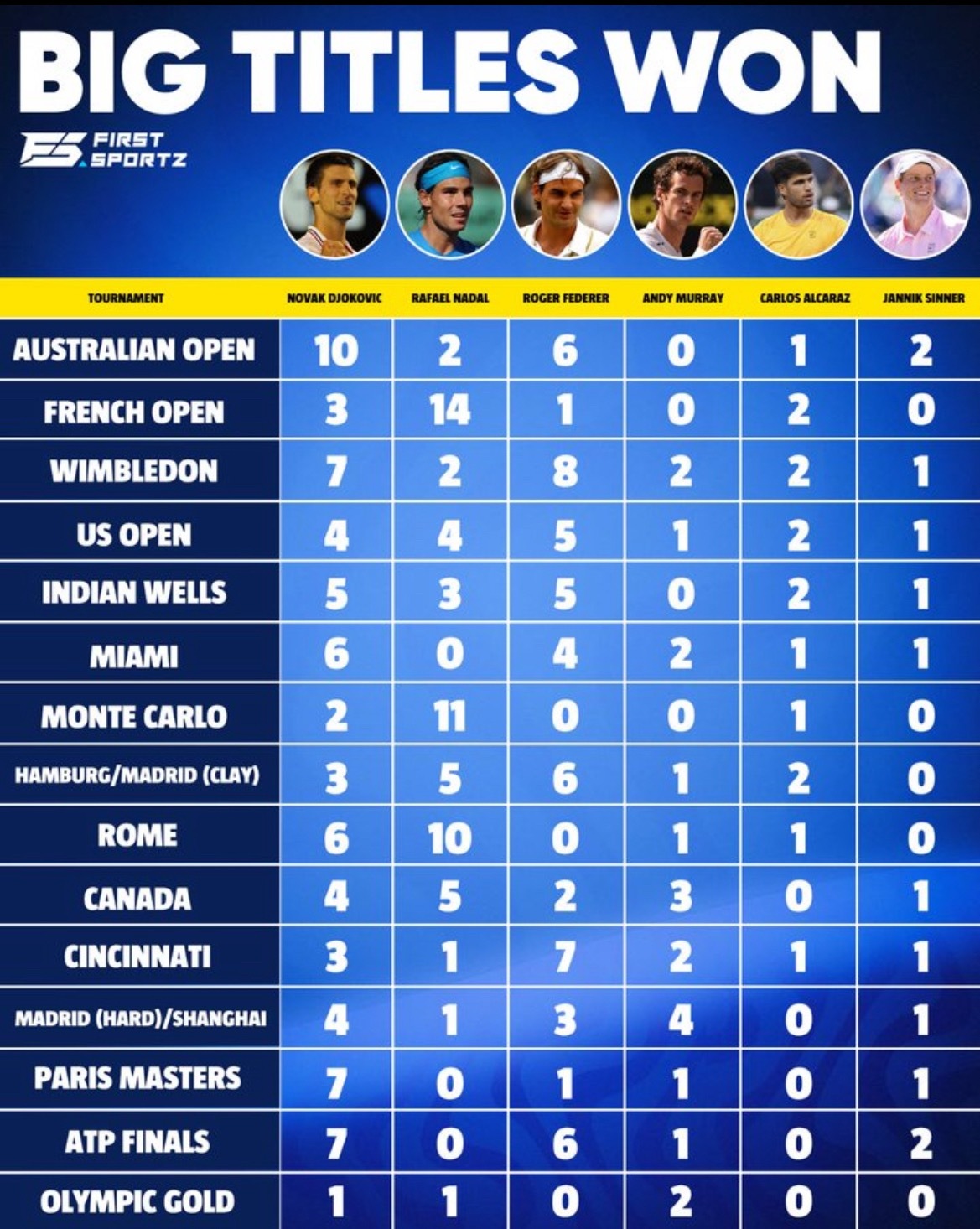 网球talking大会 四巨头与阿卡、辛纳大赛数据汇总对比:虽然穆雷在很多方便不占优,但在奥运会确实一马当先!