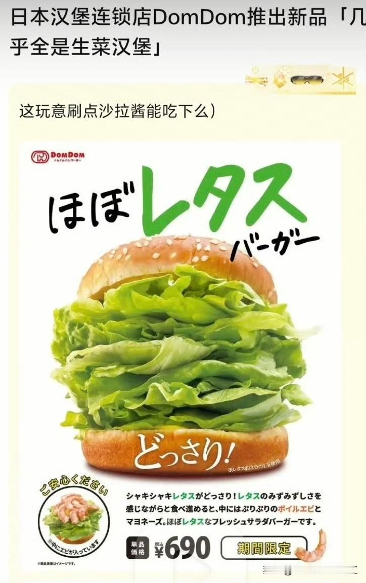 日本快餐店推出全菜汉堡,690 日元 ,约等于 29.89 元人民币。